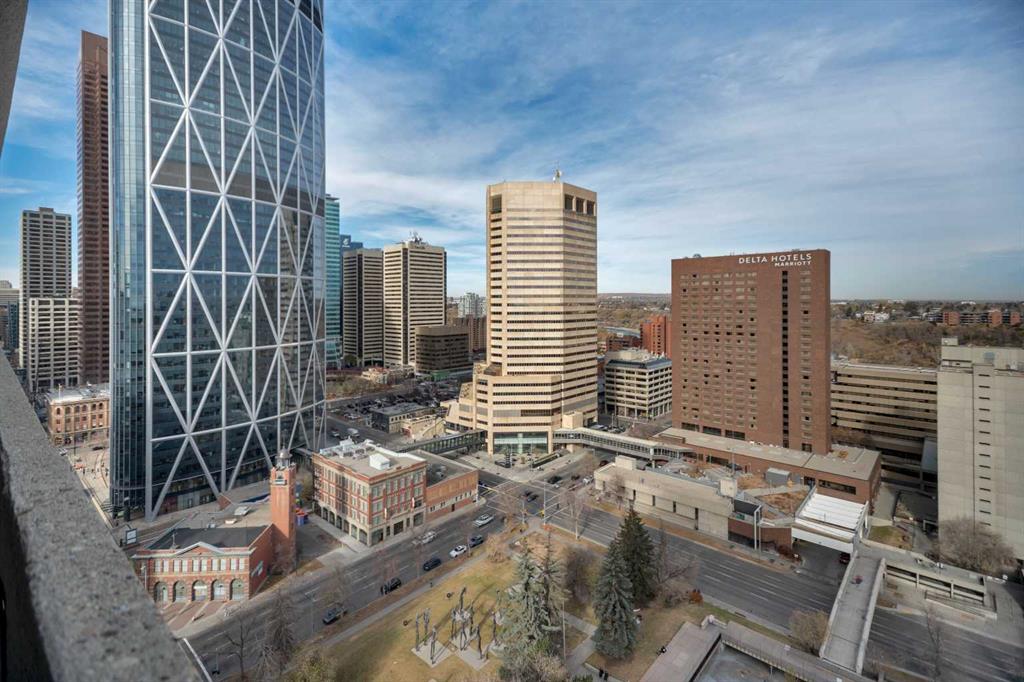 Location! Location! Location! Rocky Mountain Court. This north facing 1 bedroom home is located in the heart of downtown. Located on the 25th floor, it has a beautiful downtown view. This immaculate home has an open floor plan. Huge living room leads to an oversized balcony 8 x 27 ft. with city view. Spacious bedroom with large windows. The kitchen cabinets and bathroom sink have been replaced. The amenities of this building include laundry room on every floor, racquetball court, exercise room with sauna, a rooftop terrance and an underground parking stall (B9), secured front entrance with cameras, on-site building manager 5 days a week, evening security personnel. Endless downtown amenities are within walking distance: the Central library, Stephen Ave, Theatre/ Concert Halls, YMCA, Superstores, restaurants with varieties of cuisines, C-Train & public transportation. It is within walking distance to the Bow river & Princes Island Park. Either to have this as a rental investment or to call this your first home, it is a great buy!