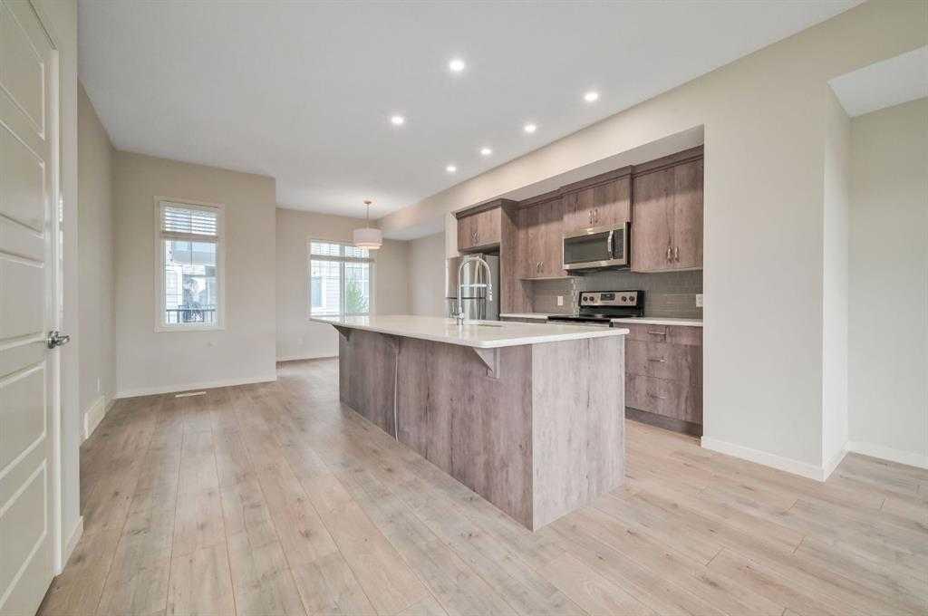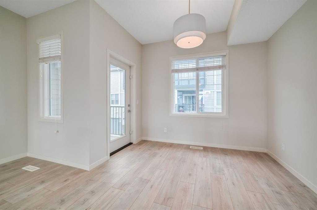 This condo is priced among the most affordable units in the complex. Welcome to this exceptional over 1,700 sq ft townhome in "The Elements of Nolan Hill" complex, offering contemporary style and a private setting backing onto single-family homes. Built in 2018, this quiet unit boasts a unique private front entrance, setting it apart from the rest of the complex. The main floor features an open-concept layout, seamlessly connecting the upgraded kitchen with sleek stone countertops and stainless-steel appliances to the spacious living and dining areas. A convenient half bath on this level adds to the functionality. Upstairs, you'll find two well-sized bedrooms, a four-piece main bathroom, and a generous primary bedroom complete with its own private ensuite. Throughout the home, enjoy the durability and modern aesthetic of luxury vinyl plank flooring and stylish tile. Step outside to your exceptionally sized balcony, perfect for entertaining or relaxing, and equipped with a natural gas line for your BBQ. The lower level provides direct access to the double-wide attached garage, along with a versatile den/flex room – ideal for a home office, gym, or media space. Location is key! This home offers incredible convenience, just minutes from Costco off Sarcee Trail and a vast array of associated shopping, restaurants, and shops. Enjoy easy access to major roadways, making your commute a breeze. This home is an ideal choice for first-time buyers or those looking to step up into a modern, low-maintenance lifestyle in a vibrant Calgary community. Don't miss this opportunity!
