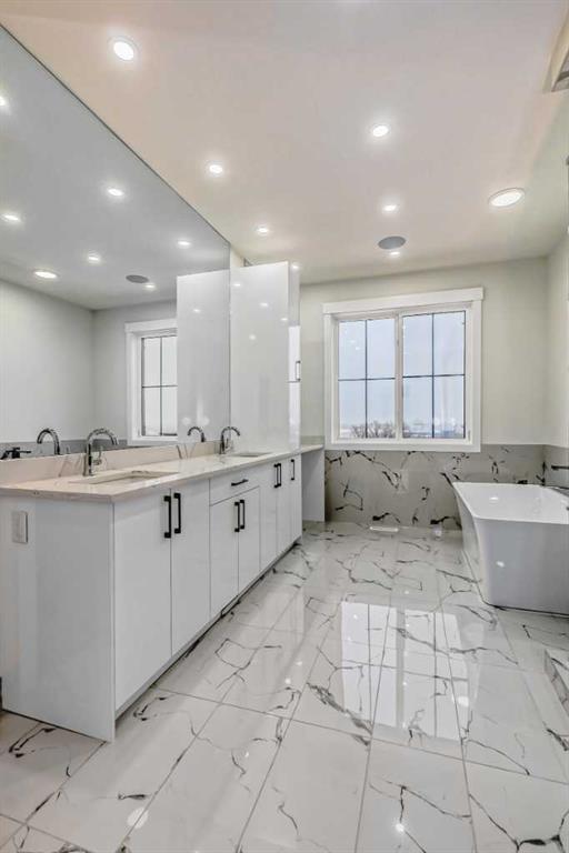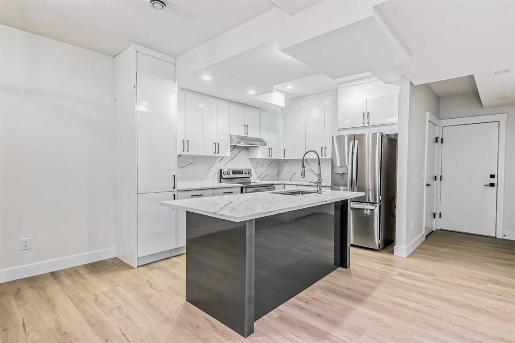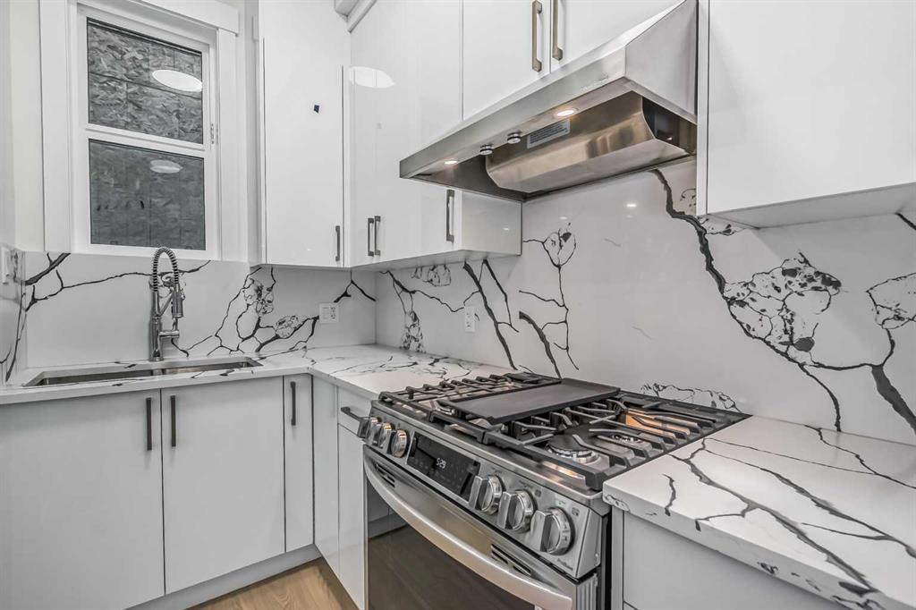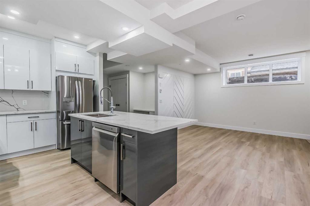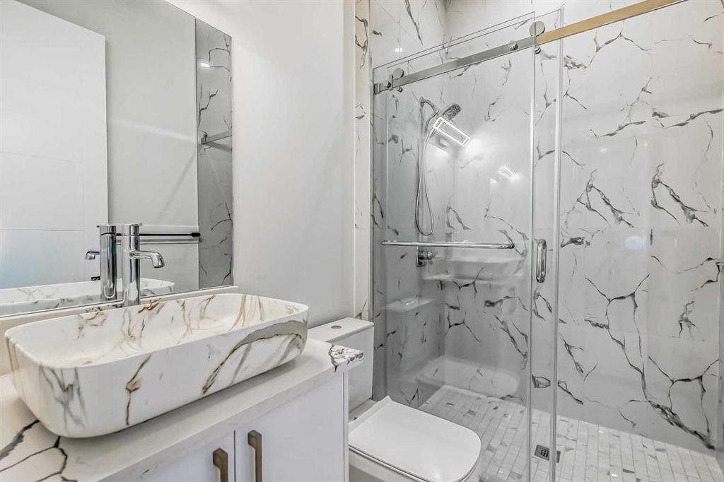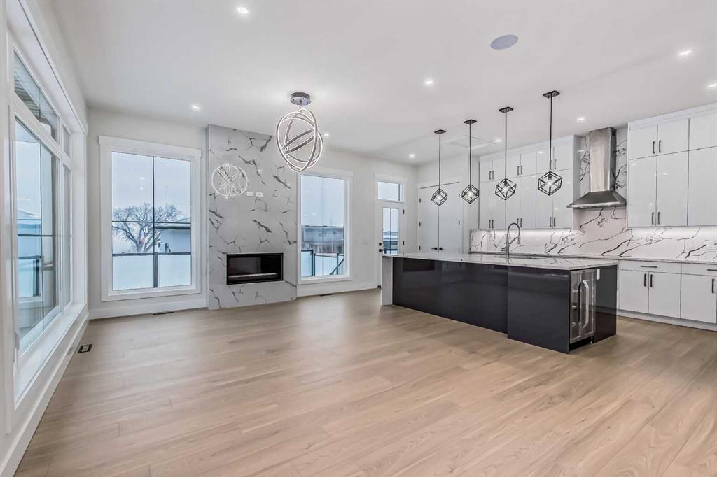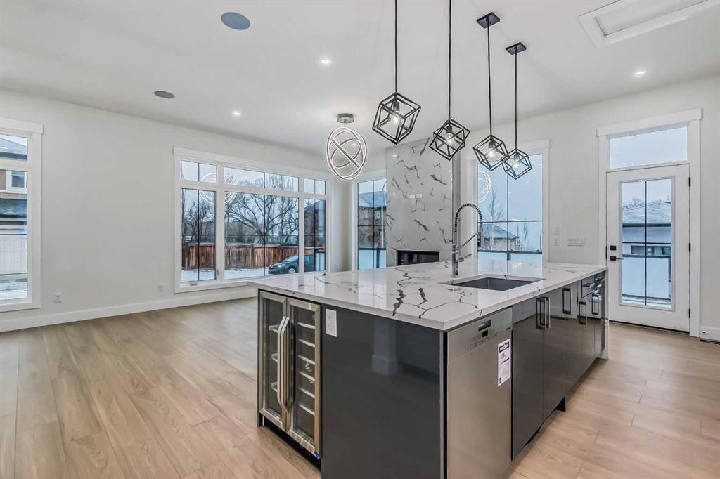 Welcome to Winston Heights, conveniently located just steps away from the golf course. This contemporary infill corner home offers nearly 3,600 square feet of living space. The property features an expansive attached garage, complemented by a separate detached garage, providing a total of four car parking spaces. The residence includes five bedrooms and 3.5 bathrooms. Abundant natural light permeates the entire home, thanks to its large windows. The main floor boasts 10-foot ceilings, an open-concept living area with premium finishes and appliances. The kitchen, featuring a marble backsplash and quartz countertops, seamlessly connects to the main living area, separated by a large island. Additionally, a gourmet kitchen and an office are situated on the main level. A glass railing guides you to the upper level. Upstairs, you will discover a spacious primary bedroom with a 5-piece En-suite and a walk-in closet. There are also two additional bedrooms, a full bathroom with dual vanity sinks, a laundry area, and a bonus room. The property includes a legal basement with a separate entrance. The basement features two well-sized bedrooms, a full bathroom, and a separate laundry facility.