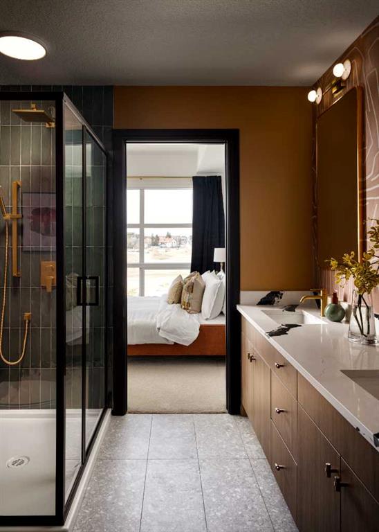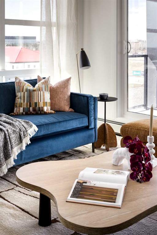 Discover the "Argento" floorplan by award-winning Rohit Homes—a bright and spacious 2-bedroom, 2-bathroom corner unit thoughtfully designed for comfort and style. Perfectly situated on the 5th floor of Quesnay at Currie Barracks, this home boasts soaring 9’ ceilings that create an airy, open feel while large windows fill the space with natural light. Featuring the bold and stylish Haute Contemporary color palette, the interior showcases a modern edge with sleek finishes and striking contrasts. The Argento offers high-end details throughout, including quartz countertops with a waterfall edge, a matching quartz backsplash, full-height cabinetry, a premium appliance package, bespoke light fixtures, and designer window coverings. The open-concept layout flows seamlessly between the kitchen, dining, and living areas, ideal for entertaining or simply enjoying everyday life. The primary suite includes a private ensuite for a touch of luxury, while the second bedroom and additional full bath provide comfort and flexibility for guests or a home office. Step outside to your ground-floor patio, extending your living space and offering a convenient connection to the outdoors. This pet-friendly and AIRBNB-approved building includes titled heated underground parking and plenty of visitor spaces. With its unbeatable location just minutes from downtown, Mount Royal University, and the vibrant communities of 17th Ave and Marda Loop, the Argento floorplan is perfect for downsizers or anyone looking for a stylish, low-maintenance home. Limited units are available—don’t miss your chance to make this striking residence yours! **Photos are taken from existing building of the same models. Not of the exact unit **