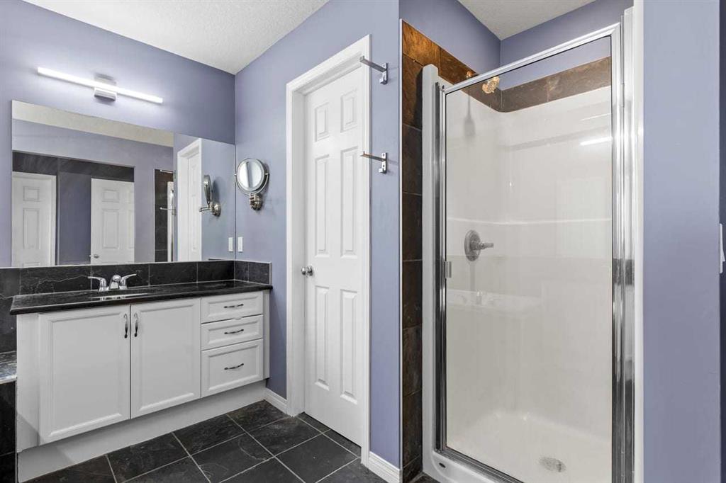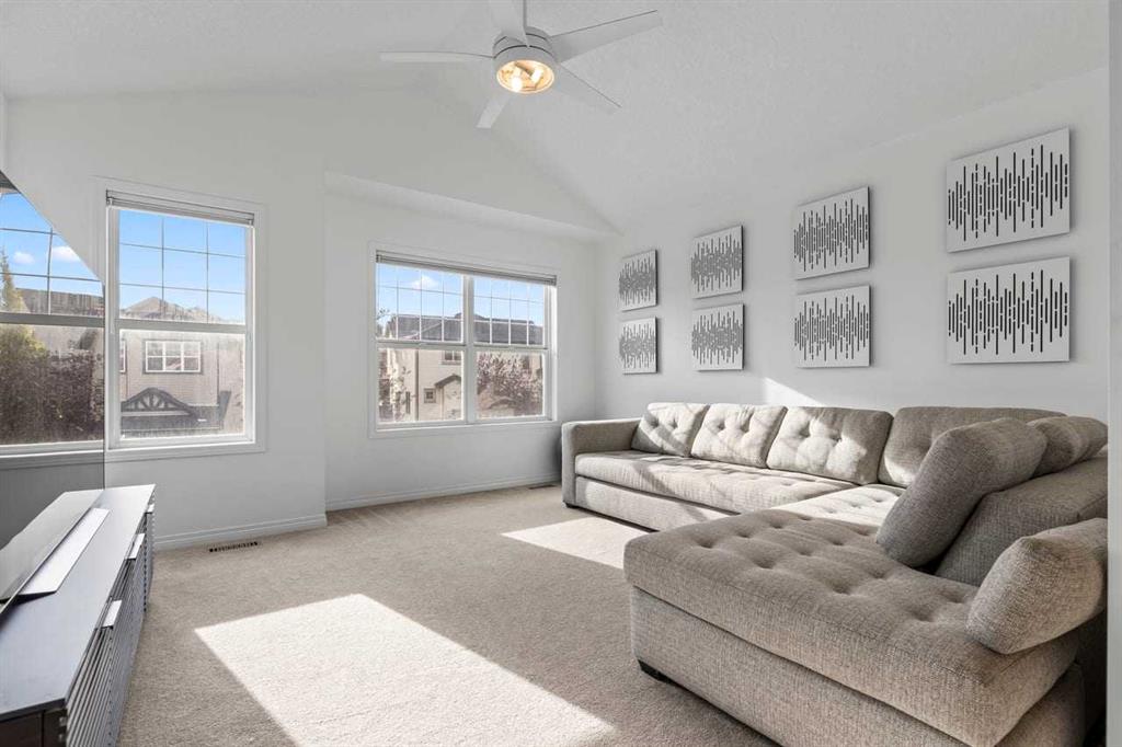 Upstairs, the vaulted bonus room captures afternoon and evening light. The spacious primary suite includes a five-piece ensuite with dual sinks, independent counters, a shower, full bathtub, and walk-in closet. Two additional bedrooms and a full bath complete the upper level.