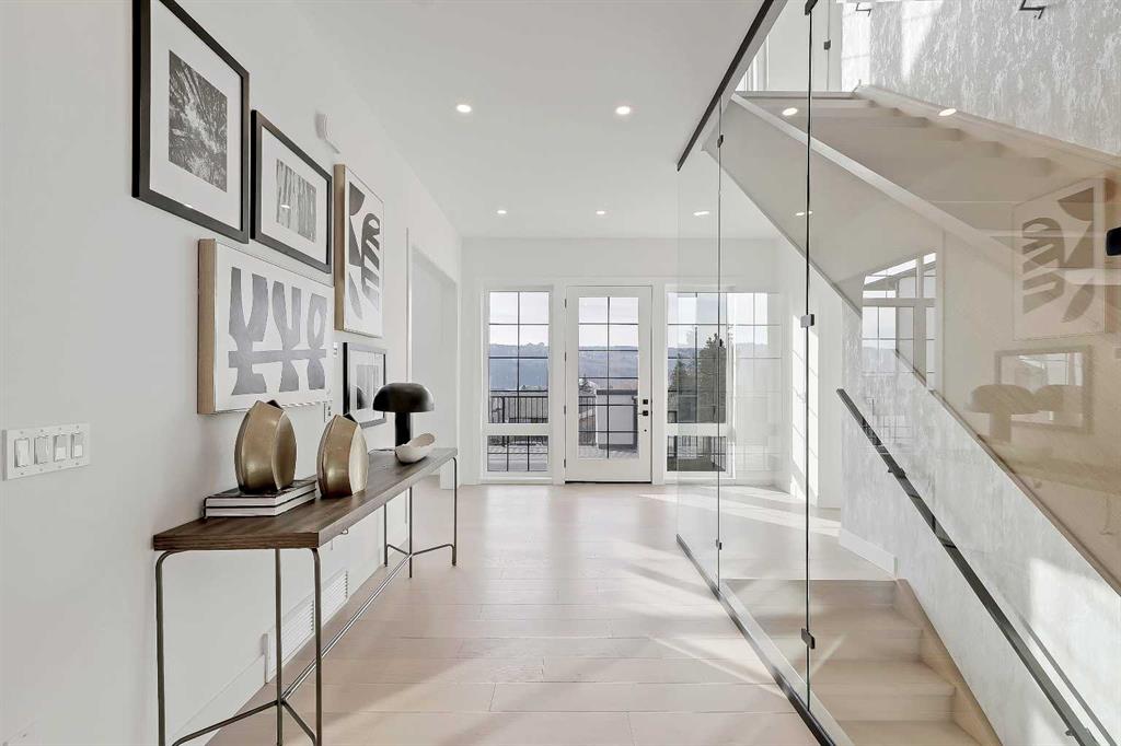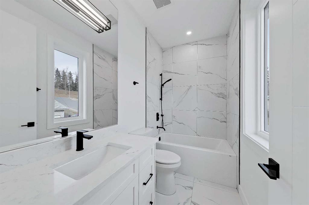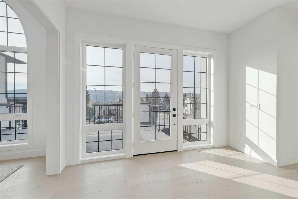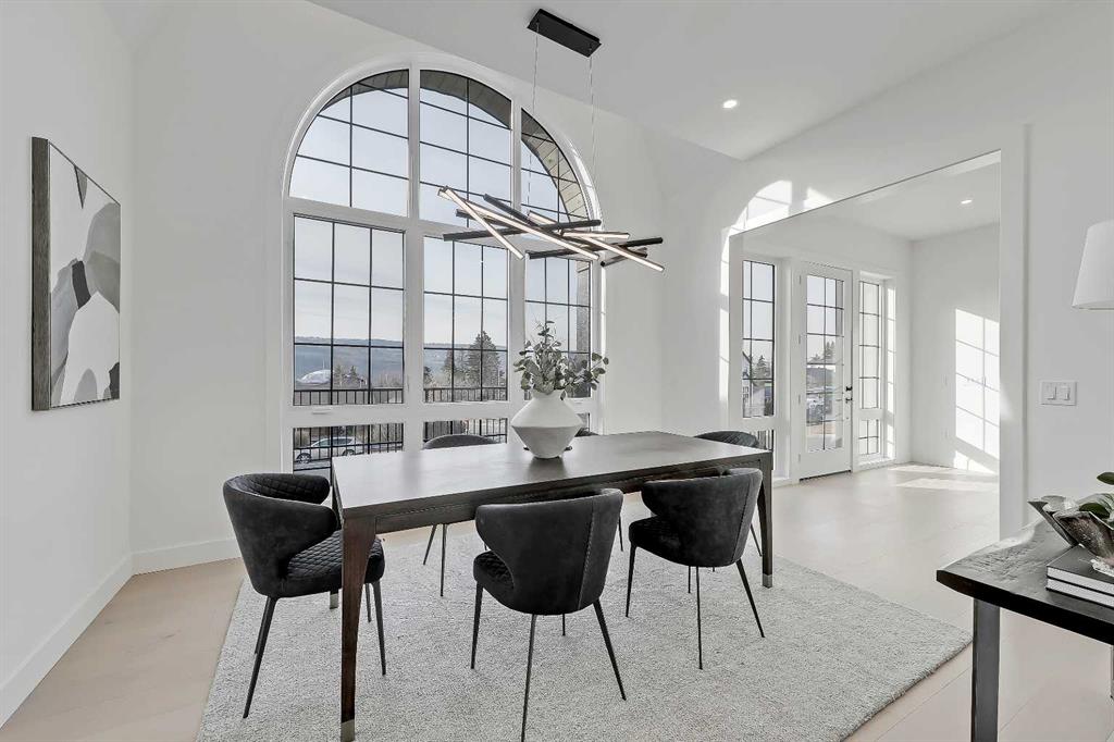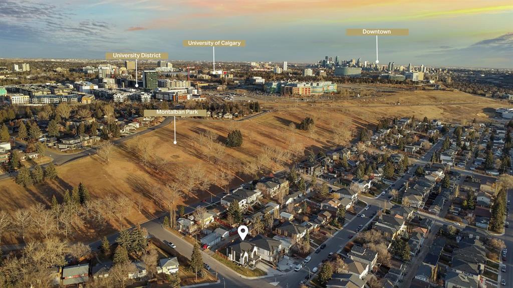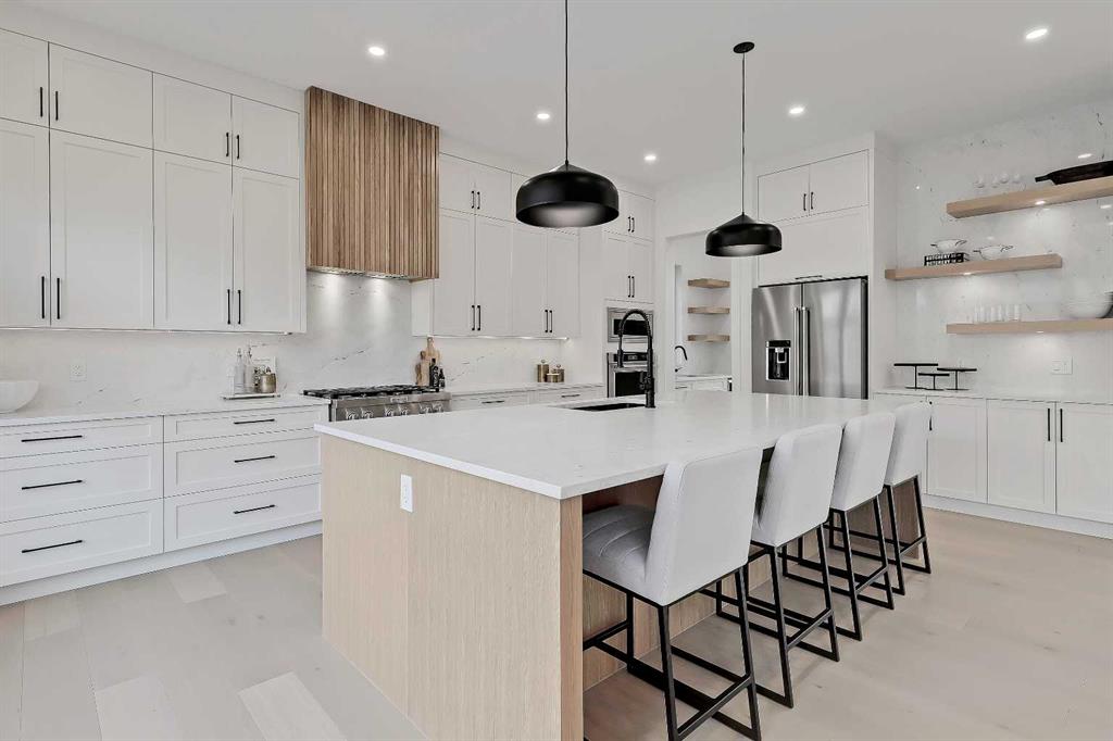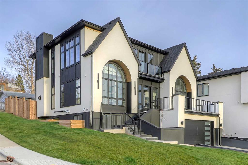 Perched high above the river valley in MONTGOMERY, this newly built estate home by NX HOMES blends bold architectural design with sweeping west-facing views and refined, contemporary comfort. Every detail has been thoughtfully curated—from the striking arched windows that flood the interior with natural light to the custom oak staircase and the cohesive balance of texture, tone, and proportion that defines each space. This is a home that feels both commanding and serene—a perfect match for its hillside setting just minutes from Market Mall, the University of Calgary, and the city’s vibrant northwest core. Inside, soaring 10-foot ceilings and a gallery-style foyer set the tone for what’s to come. The main level is anchored by a CHEF’S KITCHEN designed for gathering and performance, featuring waterfall-edge stone counters, high-end stainless steel appliances, and a large central island with seating for casual conversation. The BUTLER’S PANTRY offers extended prep and storage space, while the open-concept layout connects seamlessly to the dining area and a sunlit great room warmed by a modern gas fireplace. Oversized west windows frame mountain views, and double doors extend the living space outdoors to a generous upper deck—perfect for summer evenings and golden-hour sunsets. A front office, stylish powder room, and discreet storage complete this level with purpose and grace. Upstairs, three BEDROOMS WITH IN-FLOOR HEATED ENSUITES create private retreats for family and guests alike. The PRIMARY SUITE captures the west horizon with expansive windows and vaulted ceilings, a custom walk-in closet with built-ins, and a SPA-INSPIRED ENSUITE featuring a freestanding soaker tub, dual vanities, and an oversized glass-enclosed shower. A front-facing BONUS ROOM provides additional flexibility for a reading nook or play space, while the full-size LAUNDRY ROOM with sink keeps the upper level as functional as it is refined. The FULLY FINISHED WALK-OUT BASEMENT extends the home’s living and entertaining potential. Here, a sleek WET BAR opens to a spacious recreation and movie area—an ideal backdrop for game nights and gatherings. There’s also a fourth bedroom with a nearby full bath, a dedicated MUDROOM WITH BUILT-INS, and a rough-in for IN-FLOOR HEATING to keep every corner warm through Calgary’s winters. Every element of this property reflects craftsmanship and quality, from the ENERGY-EFFICIENT SYSTEMS and superior insulation to the TRIPLE ATTACHED GARAGE with R/I for gas heater and the low-maintenance landscaped exterior. Outdoor lighting highlights the home’s modern architecture, while the tiered front approach and private rear yard enhance curb appeal and usability. In a community prized for its views, parks, and proximity to downtown, this home stands apart—not just for its design, but for how it lives. Elegant yet welcoming, contemporary yet timeless, it’s the rare opportunity to own a truly ONE-OF-A-KIND CUSTOM BUILD IN MONTGOMERY.