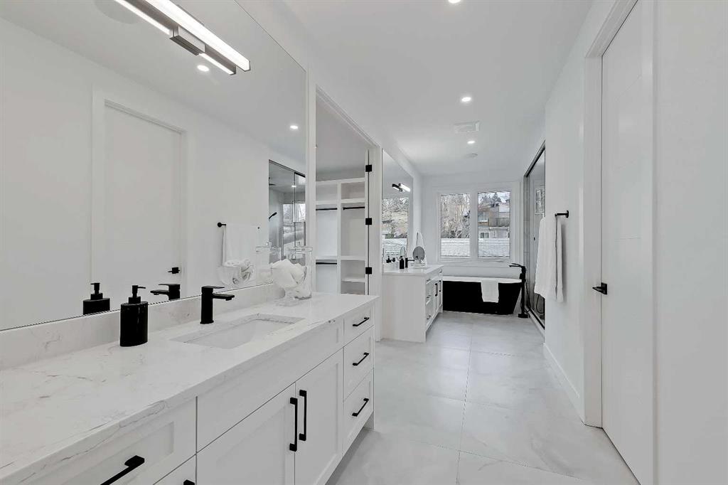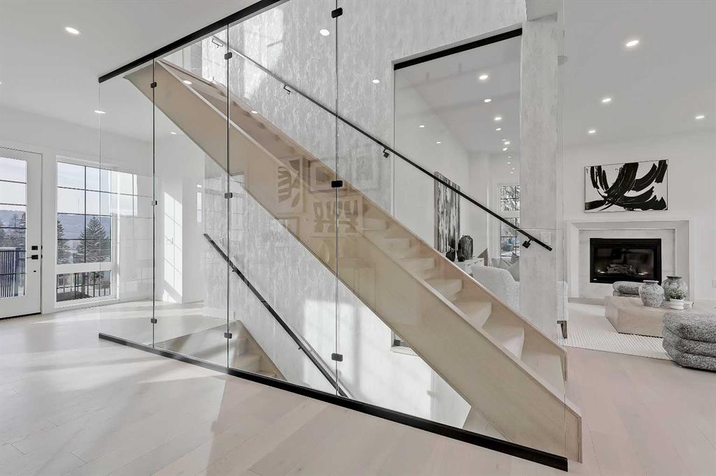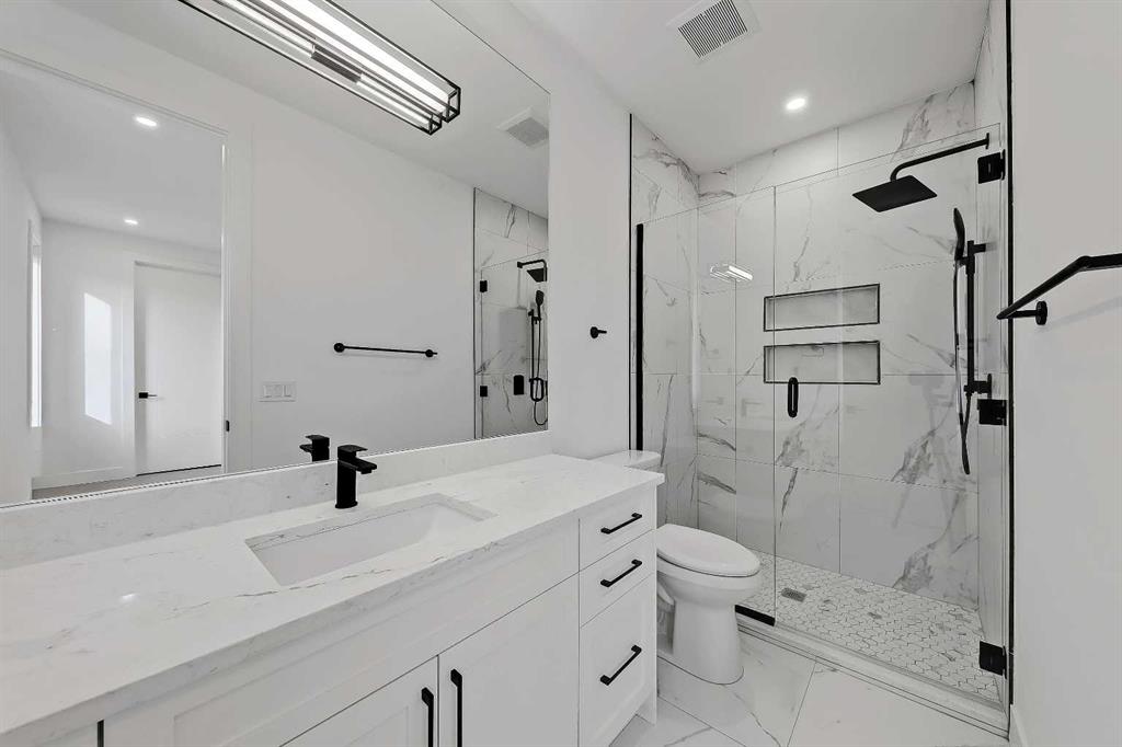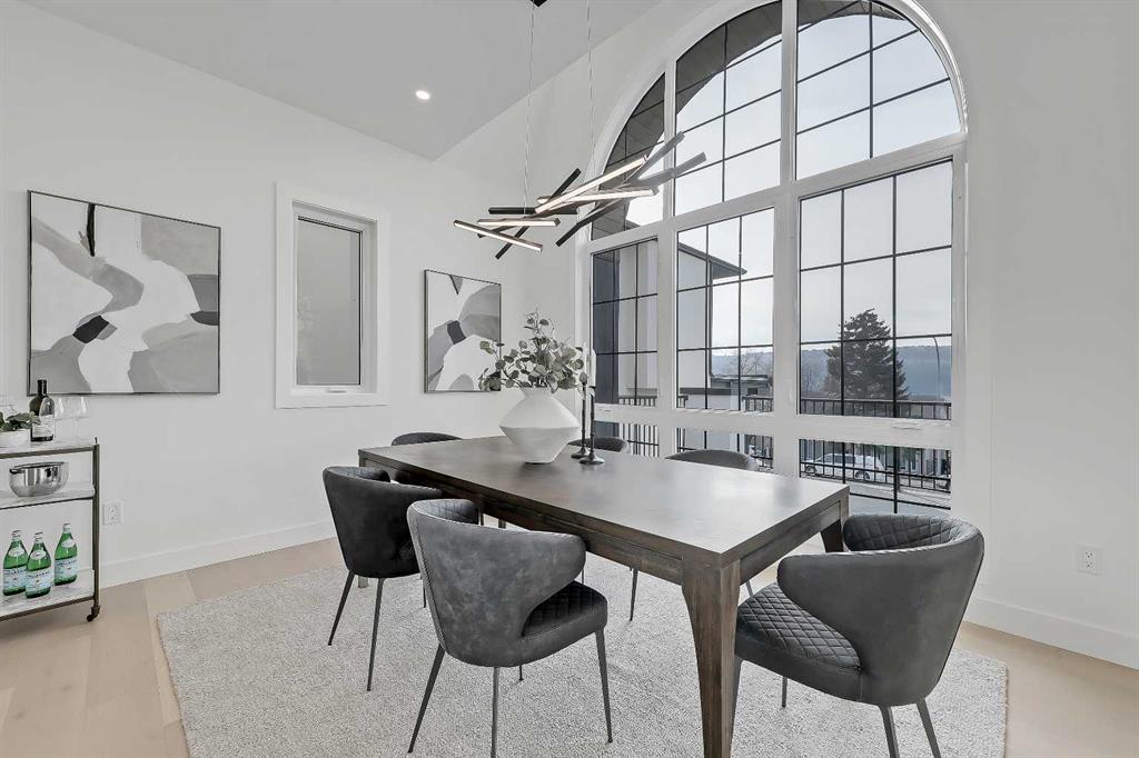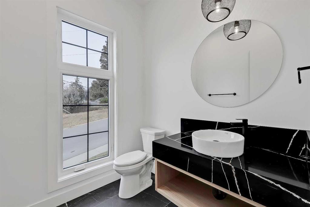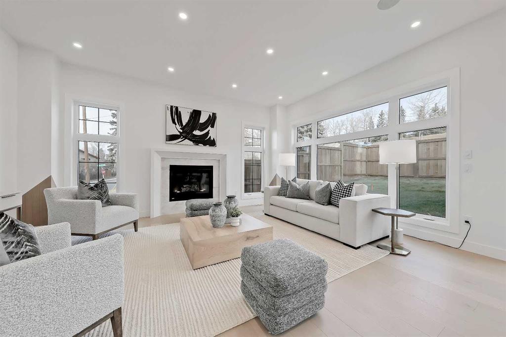 Perched high above the river valley in MONTGOMERY, this newly built estate home by NX HOMES blends bold architectural design with sweeping west-facing views and refined, contemporary comfort. Every detail has been thoughtfully curated—from the striking arched windows that flood the interior with natural light to the custom oak staircase and the cohesive balance of texture, tone, and proportion that defines each space. This is a home that feels both commanding and serene—a perfect match for its hillside setting just minutes from Market Mall, the University of Calgary, and the city’s vibrant northwest core. Inside, soaring 10-foot ceilings and a gallery-style foyer set the tone for what’s to come. The main level is anchored by a CHEF’S KITCHEN designed for gathering and performance, featuring waterfall-edge stone counters, high-end stainless steel appliances, and a large central island with seating for casual conversation. The BUTLER’S PANTRY offers extended prep and storage space, while the open-concept layout connects seamlessly to the dining area and a sunlit great room warmed by a modern gas fireplace. Oversized west windows frame mountain views, and double doors extend the living space outdoors to a generous upper deck—perfect for summer evenings and golden-hour sunsets. A front office, stylish powder room, and discreet storage complete this level with purpose and grace. Upstairs, three BEDROOMS WITH IN-FLOOR HEATED ENSUITES create private retreats for family and guests alike. The PRIMARY SUITE captures the west horizon with expansive windows and vaulted ceilings, a custom walk-in closet with built-ins, and a SPA-INSPIRED ENSUITE featuring a freestanding soaker tub, dual vanities, and an oversized glass-enclosed shower. A front-facing BONUS ROOM provides additional flexibility for a reading nook or play space, while the full-size LAUNDRY ROOM with sink keeps the upper level as functional as it is refined. The FULLY FINISHED WALK-OUT BASEMENT extends the home’s living and entertaining potential. Here, a sleek WET BAR opens to a spacious recreation and movie area—an ideal backdrop for game nights and gatherings. There’s also a fourth bedroom with a nearby full bath, a dedicated MUDROOM WITH BUILT-INS, and a rough-in for IN-FLOOR HEATING to keep every corner warm through Calgary’s winters. Every element of this property reflects craftsmanship and quality, from the ENERGY-EFFICIENT SYSTEMS and superior insulation to the TRIPLE ATTACHED GARAGE with R/I for gas heater and the low-maintenance landscaped exterior. Outdoor lighting highlights the home’s modern architecture, while the tiered front approach and private rear yard enhance curb appeal and usability. In a community prized for its views, parks, and proximity to downtown, this home stands apart—not just for its design, but for how it lives. Elegant yet welcoming, contemporary yet timeless, it’s the rare opportunity to own a truly ONE-OF-A-KIND CUSTOM BUILD IN MONTGOMERY.