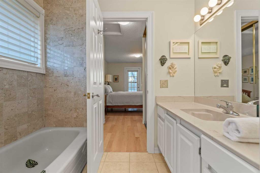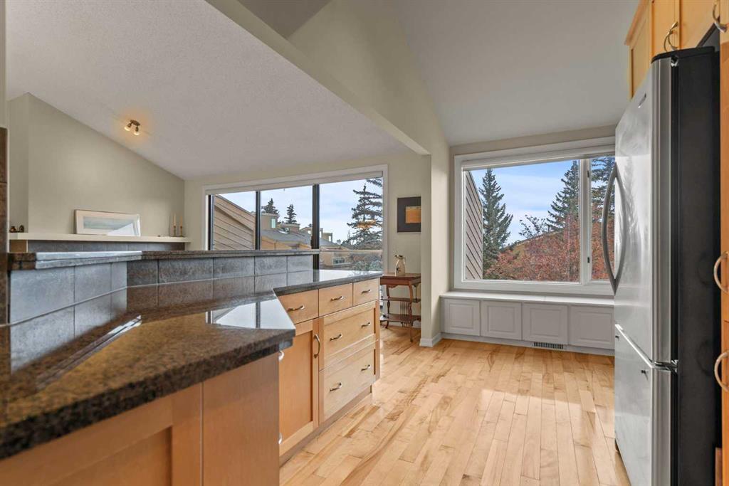 ** Be sure to watch the full cinematic home tour of this stunning home** Discover this beautifully maintained, sun-filled end unit townhome offering over 2,250 sq. ft. of elegant living space with no neighbours behind, surrounded by mature landscaping and peaceful views. Perfectly tucked within a quiet, private complex in Calgary’s desirable west-end community of Patterson, this residence blends tranquility, comfort, and convenience. The inviting lower-level walkout welcomes you with a spacious foyer and large closet, opening to a welcoming family area with a unique skylight that brings in natural light into the atmosphere rarely found in walkout levels. This floor also includes a convenient 2-piece bathroom, laundry room, and storage area for added function. The open riser staircase leads to the main floor’s bright, open-concept living space where pristine hardwood floors, vaulted ceilings, and expansive windows fill the home with natural light. The formal dining room includes an alcove for a hutch, while the living room’s wood-burning fireplace adds warmth and charm. Step through the patio doors onto a large private deck—a peaceful spot to enjoy morning coffee or evening sunsets with views. The kitchen features sleek granite countertops, a raised eating ledge, and full-length cabinetry offering ample storage. A sunny breakfast nook a casual space for everyday dining with built-in bench storage. Down the hallway, the spacious primary bedroom offers a serene retreat with a 4-piece ensuite, dual closets, and direct deck access— for quiet reading or morning coffee. The second bedroom also enjoys a 3-piece ensuite , 2nd Bedroom with3 piece cheater ensuite (can be accessed from both the room and outside) 2 closets, and deck access, making it perfect for guests or family. Quick access to the double attached insulated garage adds everyday convenience. The complex of Prominence Estates is known for its peaceful setting and walkable surroundings. Enjoy nearby Patterson Park, Edworthy Park, Westside Recreation Centre, and convenient access to the LRT, shops, and dining. Downtown Calgary is just 15 minutes away, and the mountains are only an hour from your door. Top-rated nearby schools complete the picture. This rare townhome combines privacy, sophistication, and low-maintenance living within one of Calgary’s most desirable west-end communities. Don’t miss your opportunity to make this your new home!