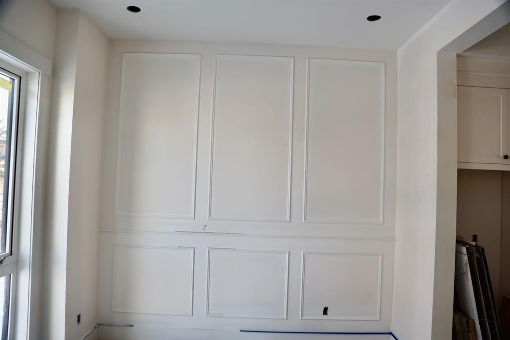 Step in from the covered entry to a bright foyer with sightlines across the open main floor, where light oak hardwood carries seamlessly through the principal rooms. The front dining room is anchored by a custom feature wall, setting the tone for the thoughtful millwork found throughout. At the heart of the home, the chef-inspired kitchen blends beauty with purpose—two full pantries, crisp white uppers over matching oak lowers, a striking waterfall quartz island, and professional KitchenAid appliances including a flat gas cooktop, built-in wall oven, and French-door fridge. Clean lines, elegant lighting, and generous prep space make this a true culinary hub.