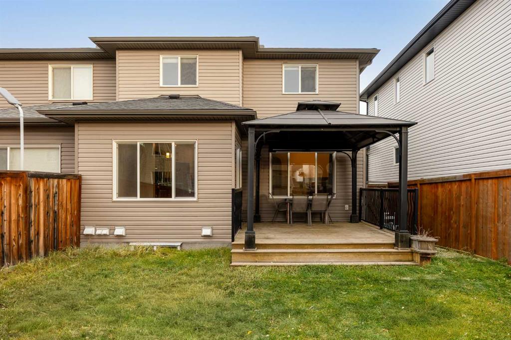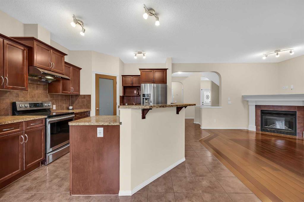 The main floor features a spacious open-concept layout with a cozy corner fireplace, a bright kitchen with stainless steel appliances, a central island, and a corner pantry. The dining area opens to a large wooden deck with a built-in pergola, overlooking the sunny west-facing backyard—ideal for relaxing or entertaining.