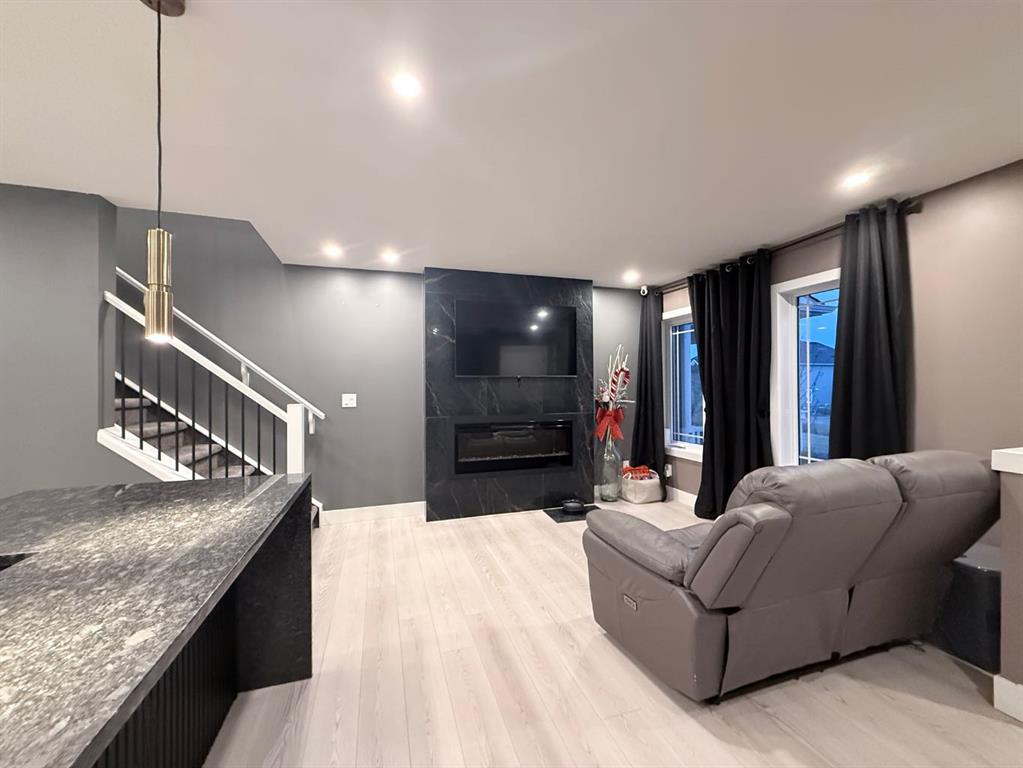 The main floor features an open concept layout with a chef-inspired kitchen, granite waterfall island, full-height cabinets with valance lighting, and stainless steel appliances. Plus a gas line making a gas stove possible. The living area showcases porcelain tile fireplaces and designer finishes that set this home apart.