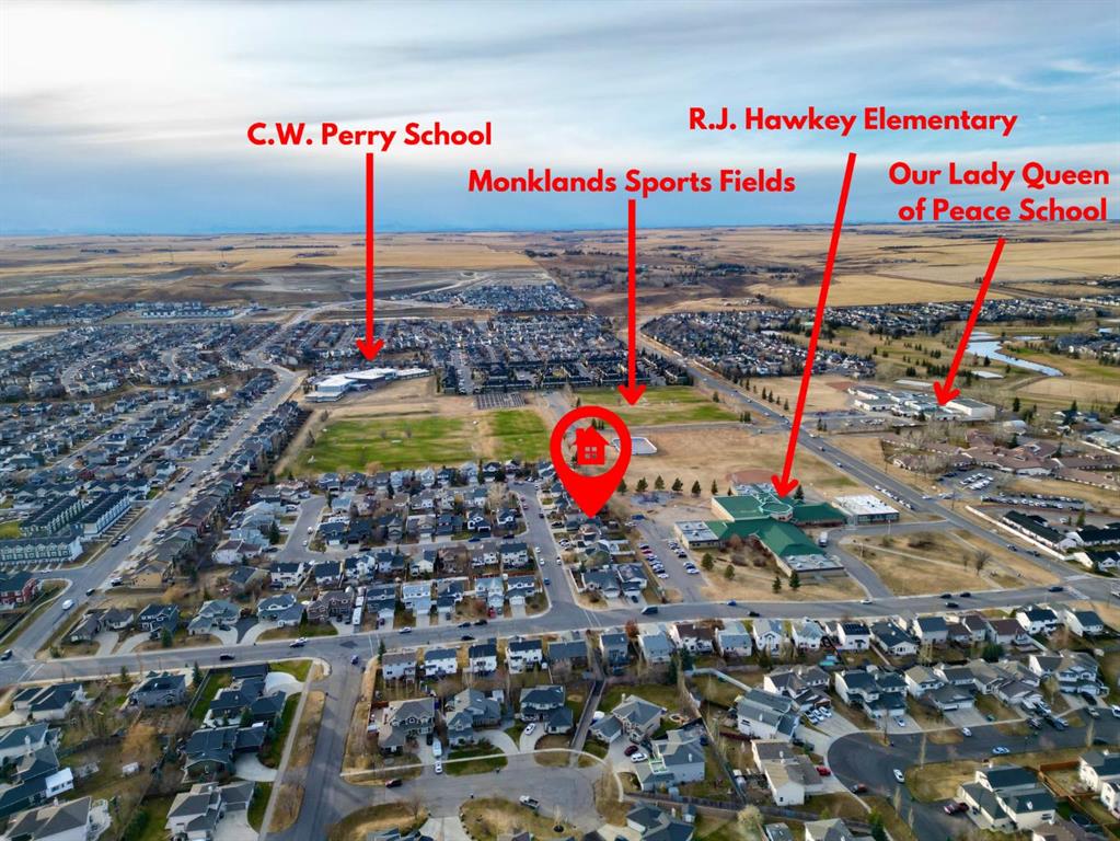 This beautifully maintained home, nestled in the serene canals of Airdrie, offers a perfect blend of comfort and convenience, backing onto green space and a school! The spacious backyard is an absolute highlight, featuring a greenhouse, raised garden beds, a well-maintained lawn, and a large privacy screen along the back fence, ensuring seclusion while you enjoy the outdoors. The expansive back deck, accessible from the eating nook, provides a perfect space for outdoor entertaining, with stairs leading down to a charming patio area. Inside, the open-concept kitchen boasts stainless steel appliances, a corner pantry, and a central island, seamlessly connecting to the eating nook with views of the backyard. The living room is bright and inviting, with a large front-facing window and a cozy fireplace with tile surround and mantle, creating a perfect spot for family gatherings. This level also features three bedrooms, including the spacious primary suite with a walk-in closet and a large window overlooking the backyard and green space. A shared 4-piece bathroom serves these main level bedrooms, offering ample space for family members or guests. The lower level is equally impressive, this fully finished space offers a great sized laundry area, three additional bedrooms, a 4-piece bathroom, and a large rec room with great with natural light. There is endless versatility for this lower level - perfect for a home office, entertainment area, or playroom. With its well-designed layout, plentiful natural light, and thoughtful design, this home offers a charming abode in a highly sought-after neighborhood, combining the best of indoor and outdoor living!