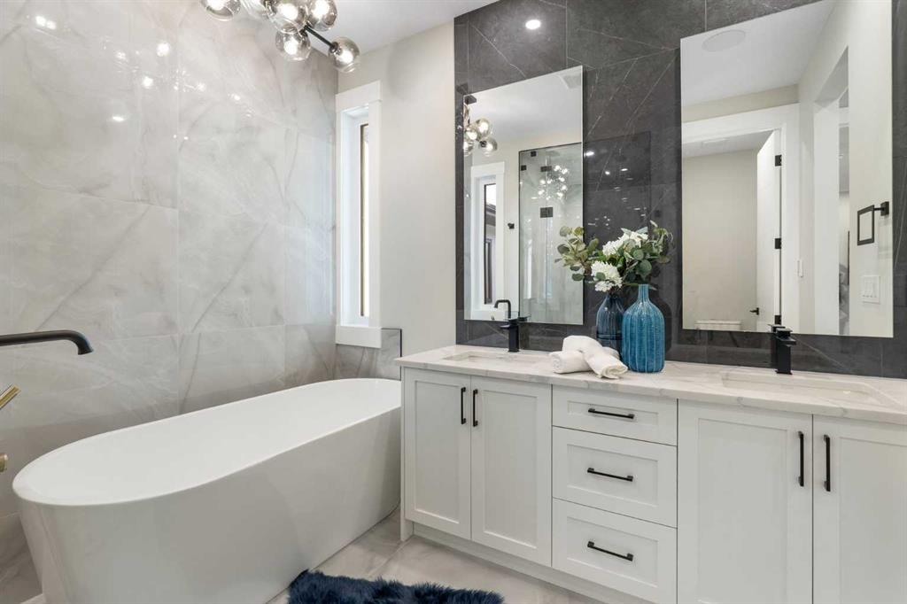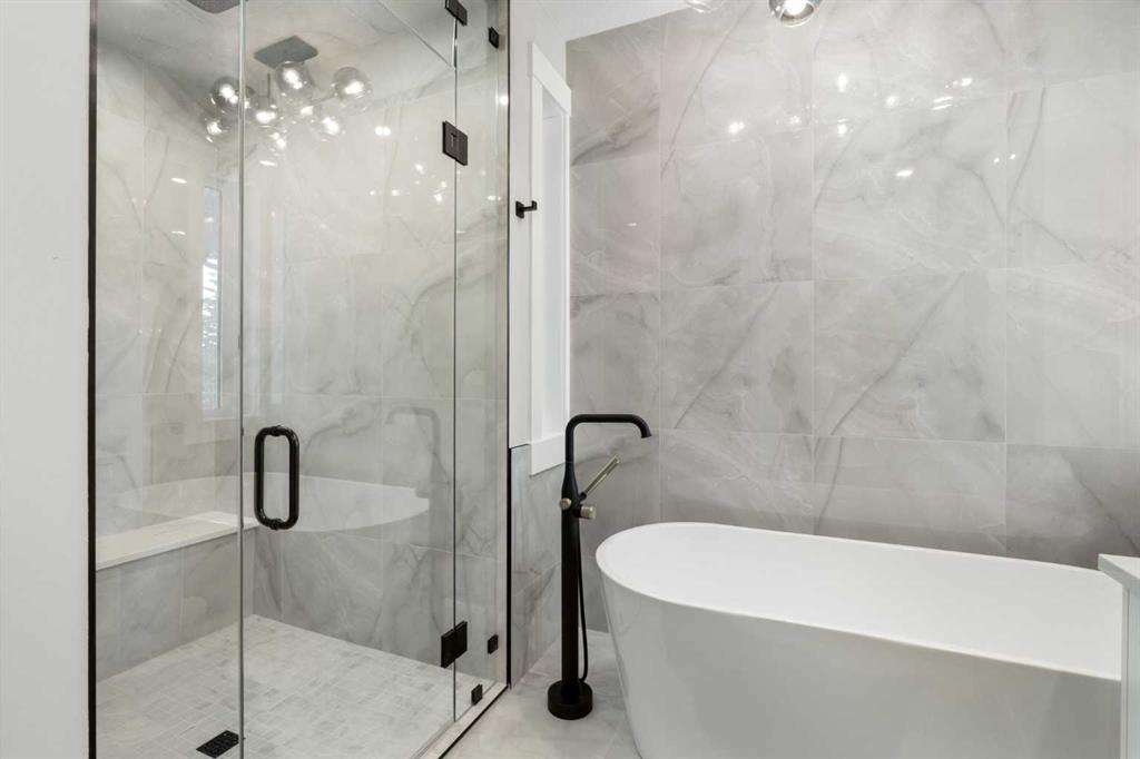 Upstairs, the primary retreat impresses with vaulted ceilings, a large walk-in closet, and a spa-inspired ensuite with dual sinks, a freestanding tub, and a glass-enclosed shower. Two additional bedrooms, a stylish main bath, and convenient upper laundry complete this level.
