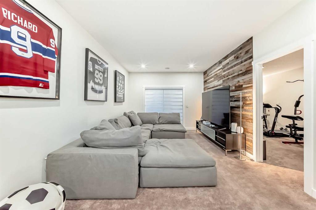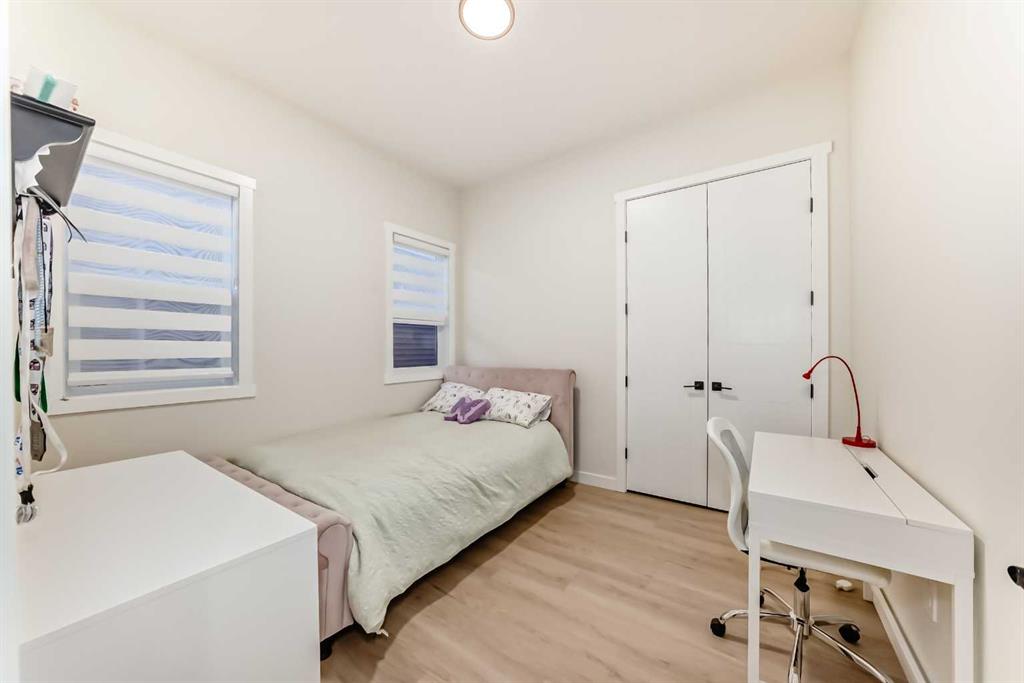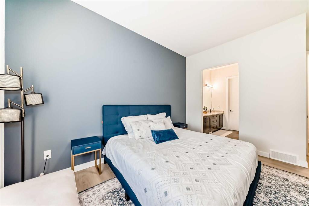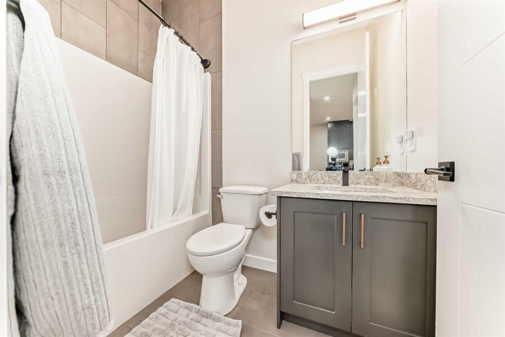 The main floor features a modern chef’s kitchen with a large island, stainless steel appliances, gas range, and custom built-ins that don’t disappoint, including custom zebra blinds throughout . From the adjacent balcony, enjoy west-facing mountain views and the convenience of a natural gas line for your BBQ or heater. The spacious primary bedroom is complete with a generous walk-in closet and a luxurious 4-piece ensuite. A second bedroom and additional 4-piece bathroom complete the upper level. High ceilings and contemporary finishes keep the space feeling open and inviting.