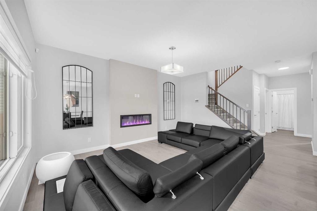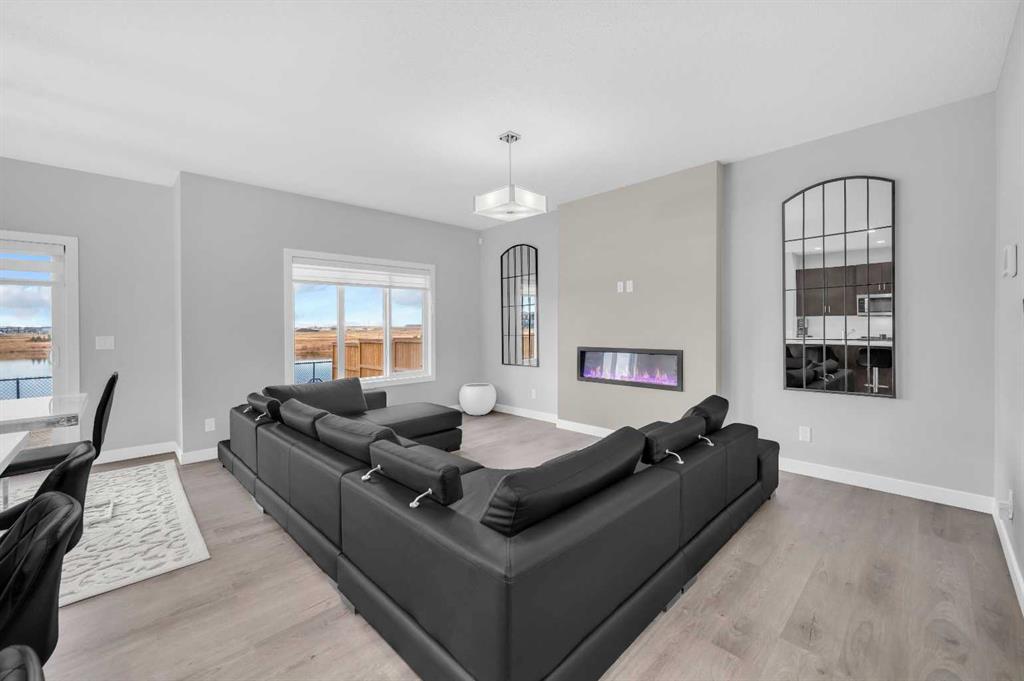 MAIN FLOOR BEDROOM & FULL BATHROOM, SPICE KITCHEN, BACKING ONTO POND. Welcome to this beautifully upgraded home set on a 34-ft wide lot backing onto a peaceful pond offering true privacy with no neighbours behind. This bright and spacious property features a main floor bedroom with a full bathroom, perfect for guests or multi-generational living. The open-concept kitchen shines with modern finishes, quartz counters, a large island, and a fully equipped SPICE KITCHEN. Large windows in the living room fill the home with natural light all day long. Fireplace also adds very elegant feature to the living area. Upstairs, you’ll find three comfortable bedrooms, including a stylish primary bedroom with 5 piece ensuite and walk-in closet, another bedroom can accommodate a king size bed with its own walk-in closet. Along with a generous bonus room and multiple windows the upper floor looks bright. The side entrance to the basement with 9ft ceiling provides perfect opportunity to develop a two-bedroom suite and adding future value. The backyard is fully landscaped and fenced, complete with a deck and patio pad overlooking the pond—ready for summer gatherings and peaceful evenings outdoors. This home offers brightness, privacy, and future income potential—perfect for families. A must-see property in a fantastic Cornerstone community.