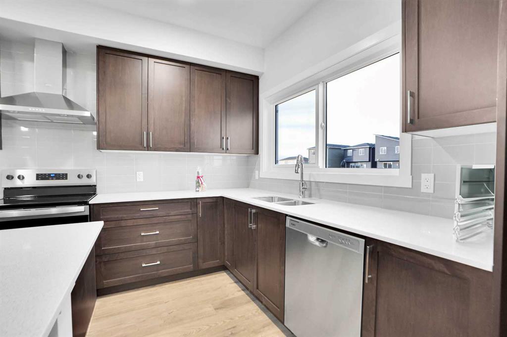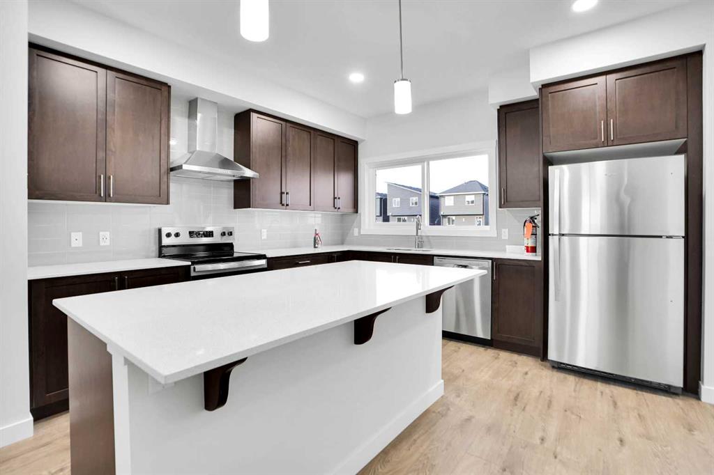 Welcome to this beautifully upgraded semi-detached home in the heart of Cornerstone, perfectly positioned facing green space and an environmental reserve! Offering exceptional curb appeal with its charming front verandah, this 3-bedroom, 2.5-bathroom home combines modern design, thoughtful upgrades, and functional living spaces ideal for families. Step inside to an open-concept main floor featuring 9 ft. ceilings, elegant knockdown ceilings, and large windows that flood the space with natural light. The gourmet kitchen is a standout, complete with quartz countertops, a spacious island, chimney hood fan, and ample cabinetry—perfect for cooking and entertaining. The dining and living areas flow seamlessly, creating a welcoming atmosphere.