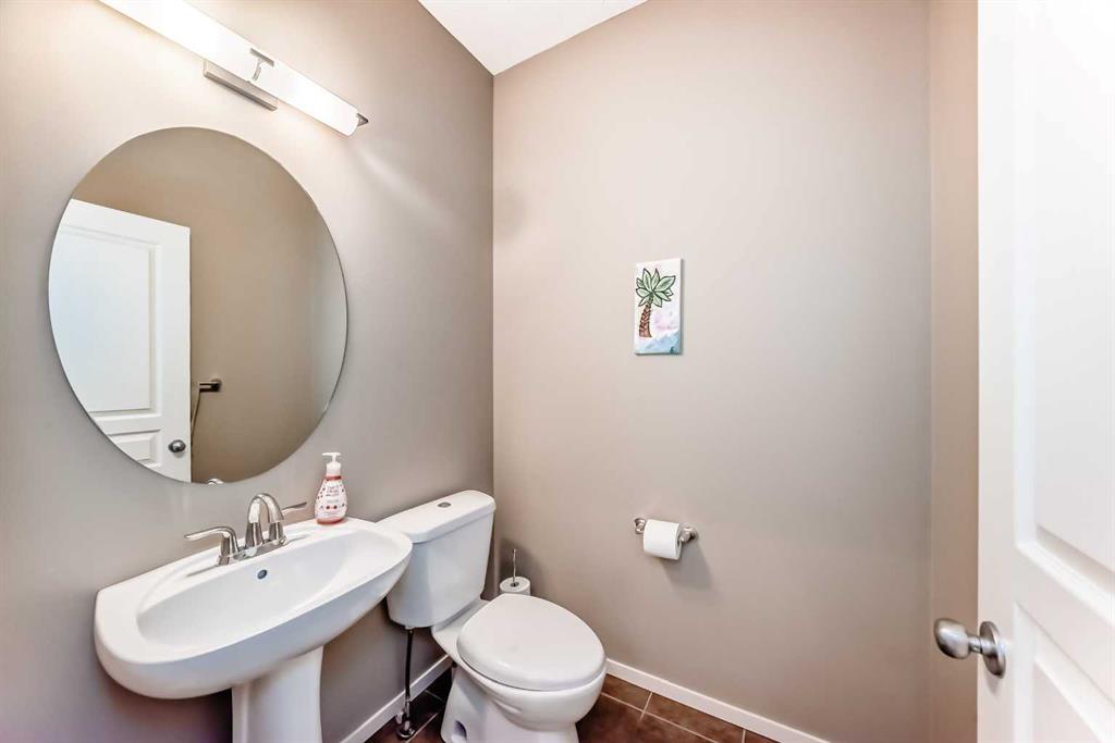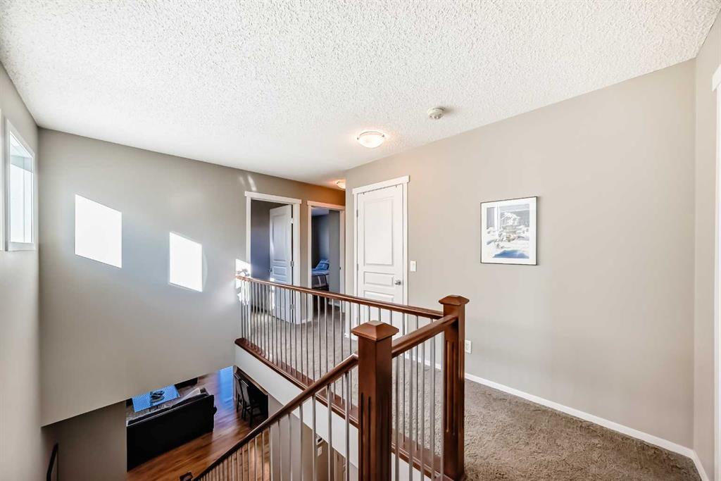 The home features a dramatic staircase enhanced by a tasteful wrought iron upgrade, adding a touch of grandeur to the interior. Main floor potlights illuminate the space, highlighting its architectural beauty, while swing closet doors provide easy access to storage.