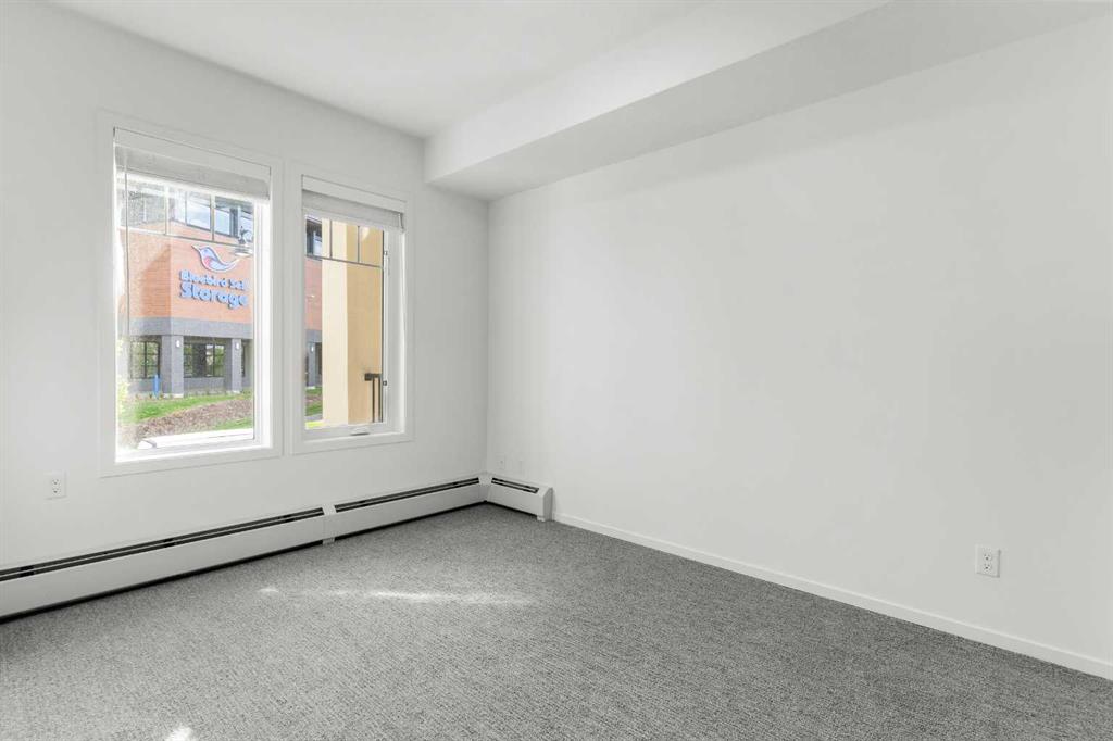 The bedroom features soft carpeting, a walk-through closet, and direct access to a semi-ensuite bath. Plus, enjoy the bonus of a separate laundry/storage room with stackable washer and dryer — a rare and practical feature.