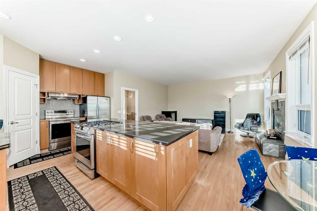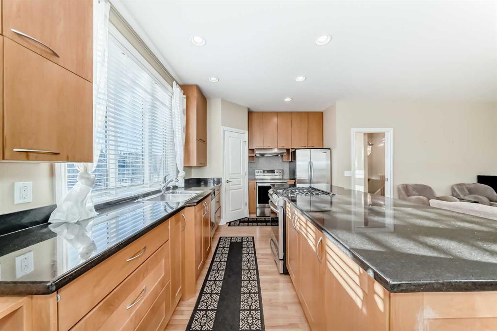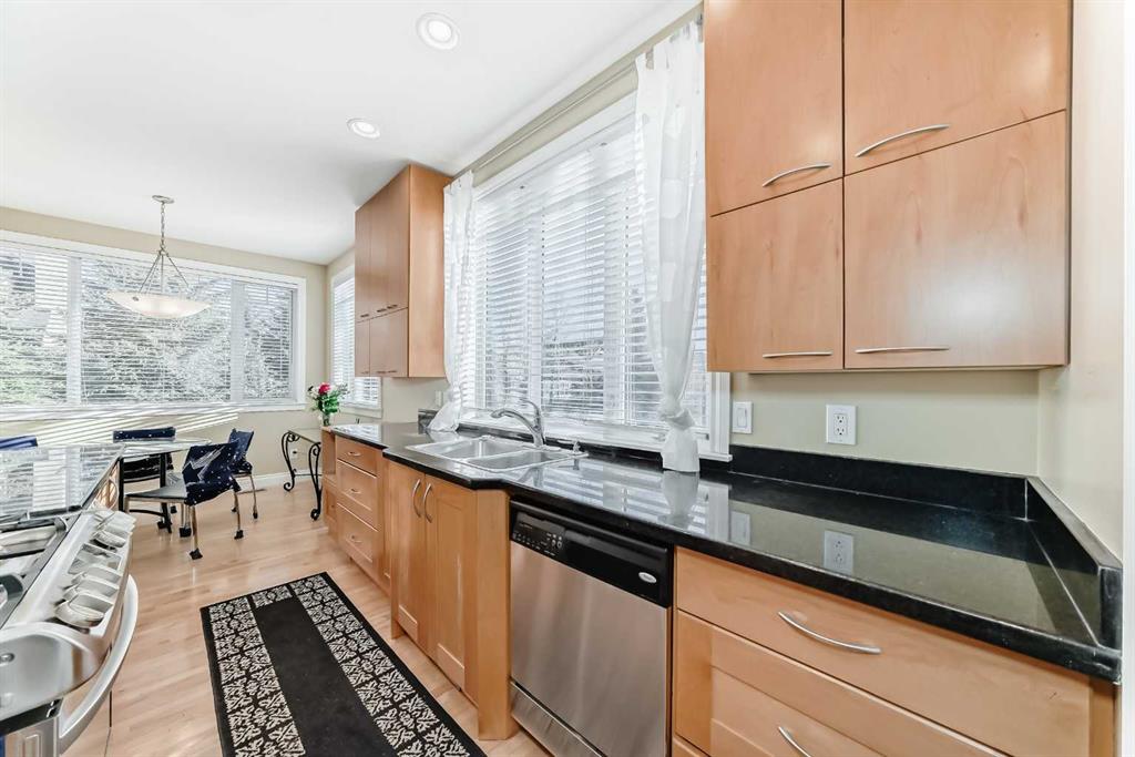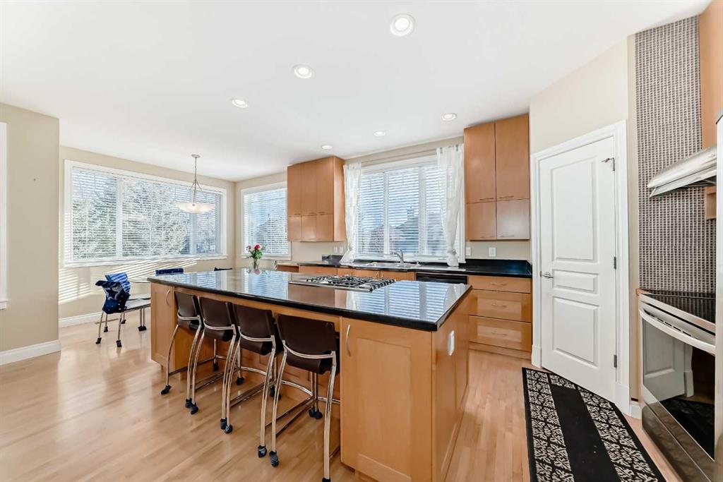 The kitchen is equipped with maple cabinetry, granite countertops, a large island, and a bright, sunny eating nook. Additional features include an oversized dry walled double garage with built in shelving. 2 decks, 2 fireplaces, maple hardwood flooring, and in-floor heating in the basement.