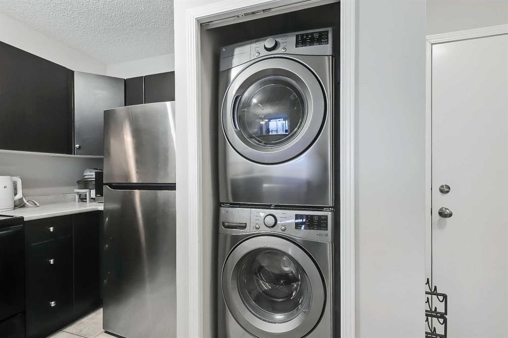 Perched on the 18th floor of Vantage Pointe in the heart of the Beltline, this thoughtfully designed 2-bed, 2-bath condo delivers an elevated lifestyle—literally! With a smart, zero-wasted-space layout and only one shared neighbour wall, it is an appealing option for buyers who want comfort, quiet, and convenience without compromise. From the moment you step inside, the unit feels bright and inviting. The tiled foyer leads to the kitchen, where you’ll find an updated stainless steel fridge and dishwasher, ample counter space, generous cabinetry, and a raised breakfast bar. The open-concept layout creates a natural flow into the living room, finished with laminate flooring and perfectly sized to adapt to a variety of lifestyles. Whether you prefer a combined living/dining setup or a living room with a dedicated home office or reading nook, the space easily accommodates it. A large west-facing window pours in natural light and frames wide-open skyline and mountain views, while the attached balcony provides that rare “open-air” feel so many condos lack—perfect for sunset unwinding or a quiet morning coffee. The primary bedroom is impressively spacious, complete with large windows and blackout blinds. A dedicated A/C unit keeps the room cool in the summer (and cools the whole unit), and the private 3-piece ensuite offers a glass stand-up shower. The secondary bedroom is equally versatile, ideal for overnight guests, a second office, or a hobby room. Right across the hall, the main 4-piece bathroom features a tiled tub/shower combo. Practical upgrades include an in-suite laundry closet with an updated stacked washer/dryer, secure underground heated parking (with a stall conveniently close to the elevator), and fob-controlled keyless entry and elevator access. The building itself supports an easy, connected lifestyle: two bike storage rooms, plentiful visitor parking, 24/7 concierge service, and a well-equipped gym (currently undergoing upgrades). Location is one of this condo’s strongest assets. Positioned directly across from the Midtown Co-op, day-to-day errands become effortless; you can even access the Co-op through the underground parkade. The Downtown West–Kerby CTrain Station is less than a 10-minute walk away. Plus, some of Calgary’s most vibrant destinations are right at your doorstep: 17th Avenue’s restaurants and nightlife, Stephen Avenue’s shops and cafés, the downtown core, the Bow River Pathway network, the Calgary Public Library, and countless fitness studios, markets, and pocket parks. This home offers the kind of lifestyle buyers appreciate but rarely find at this price point: views, convenience, comfort, and a building with a long-standing reputation for strong management and amenities. Schedule your private showing today!