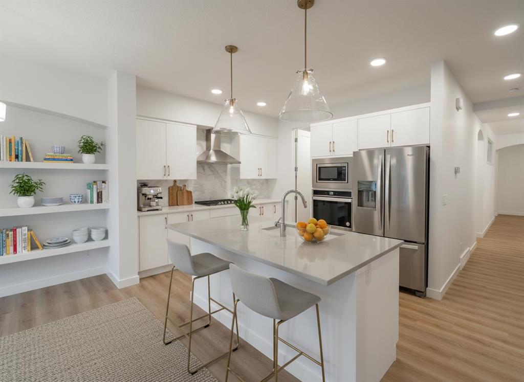The gourmet kitchen is a standout, complete with sleek quartz counters, a central island, built-in gas cooktop, and a dedicated spice kitchen for added prep space and enhanced cooking versatility.