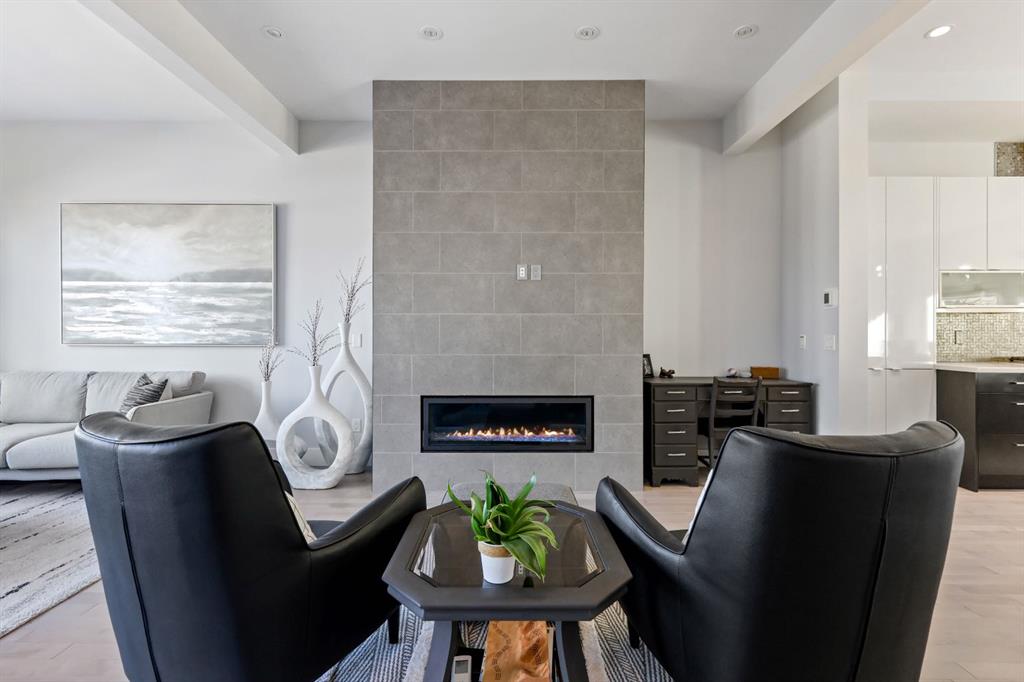 The upper level hosts a serene primary retreat featuring a light-filled 5-piece ensuite with a two-way gas fireplace and a generous walk-in closet. Two additional bedrooms, a well-appointed shared bathroom, and a convenient laundry room complete this level. A discreetly located 2-piece powder room sits on the landing to the lower level.