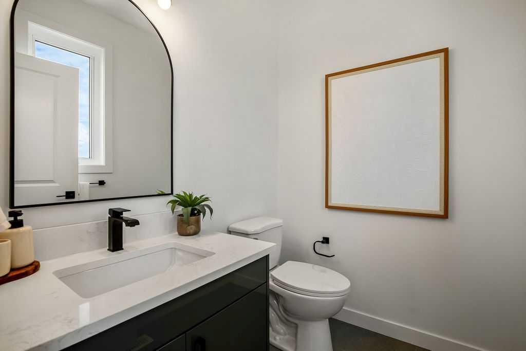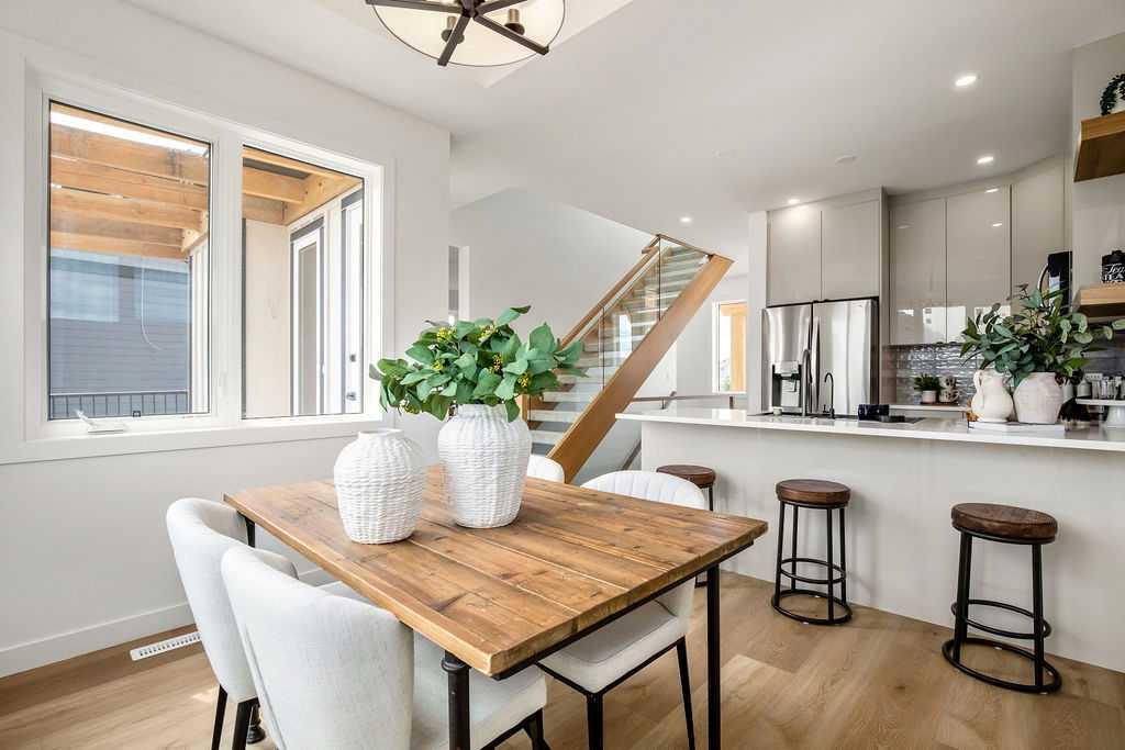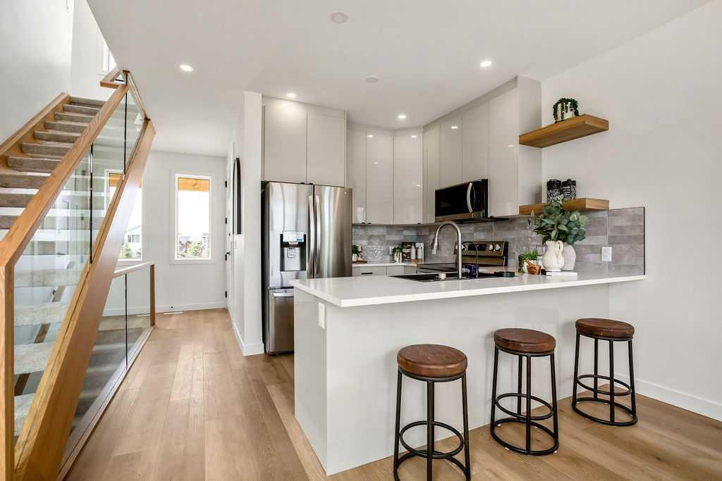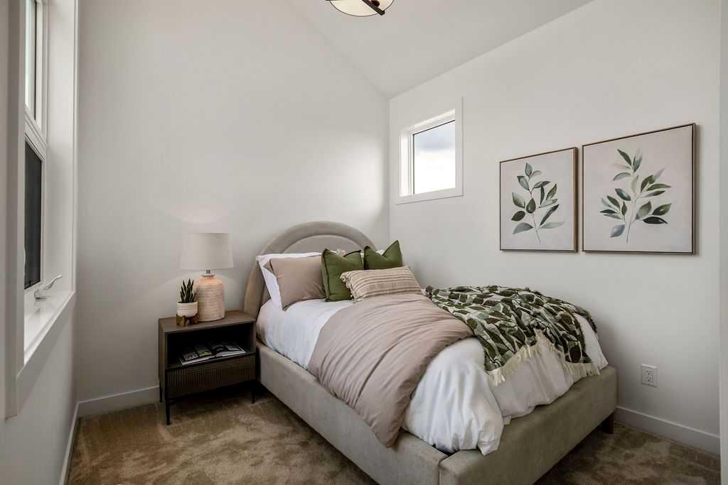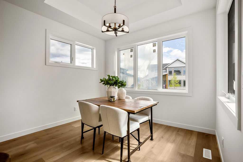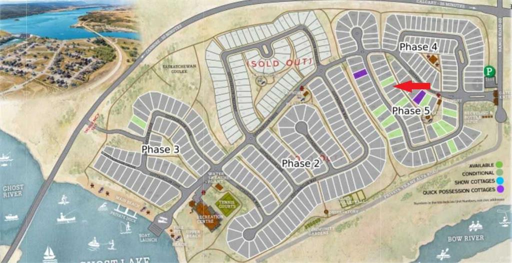 FORMER SHOWHOME! Crafted by a custom home builder, this new home showcases care and custom design throughout. Every inch of this 1,100 square foot developed home has been thoughtfully planned and executed, creatively utilizing every square inch. Main floor features a functional layout with half bath, living room, dining room and kitchen. Kitchen is an optimal u-shape offering ample cabinetry and counterspace. Overlooking the dining area which is upgraded with a tray ceiling and encased with oversized windows that flood the space with an abundance of natural light. Off the kitchen and dining area you will find the cozy living room with an upgraded Napoleon fireplace. This space offers direct access through an oversized doorway to the very large 17x12 deck. An exceptional place to spend summer evenings barbecuing and spending time with friends and family! The thoughtfully designed staircase with glass railing leads you to the upper level. Here you will find a large 4-piece bathroom with dual sinks, 2 bedrooms and a linen closet. Both bedrooms feature functional closets, with the primary bedroom spanning an impressive 100 square feet. The front bedroom is particularly unique, featuring a vaulted ceiling, mountain views captured through the oversized windows. In the basement you will find the laundry and a 550 sq ft unfinished space awaiting a custom touch. The space, and window size can accommodate an additional bedroom and also a bathroom (roughed in), plus living space. Making it a very functional and exceptional future value add to this home. Outside you can enjoy the sunny front West facing porch under the striking timber pergola. Exterior siding is a durable composite providing piece of mind. This home comes with front parking, a garage could still be added at an additional cost. No expense has been spared in using upgraded materials throughout the building process and in the finishing touches. Features include Duradek on the front and back decks, stone countertops, and upgraded plumbing and lighting fixtures throughout. Conveniently located around the corner from the main entrance of this gated community and within walking distance to the lake and recreation center, this property offers exceptional value at the listed price point. Residents can enjoy the community's incredible and unique amenities, such as an indoor pool, hot tub, fitness center, sandy beach, outdoor grill, playgrounds, numerous walking paths, and much more. Only 45 minutes from Calgary, and 10 minutes to the amenity rich town of Cochrane makes comfortable 4-season cottage living a reality. There are only 3 homes remaining that are ready for possession today!