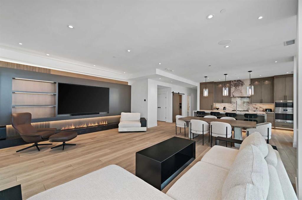 The culinary experience here is nothing short of exceptional. The chef-inspired kitchen showcases quartz waterfall countertops, upgraded fixtures including a premium kitchen faucet and pot filler, and a lineup of elite appliances: 36" Sub-Zero fridge/freezer, Wolf gas cooktop, wall oven and built-in microwave. A rare butler’s pantry—appointed with custom cabinetry, a wine fridge, and an additional built-in Miele coffee machine—elevates both function and sophistication. Host with ease around the oversized island or unwind beside the mesmerizing 80" water-vapour steam fireplace, with a 100" living-room TV creating a true theatre-like atmosphere.