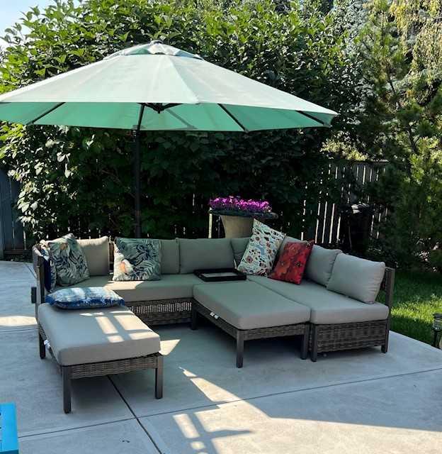 Step outside to discover outstanding outdoor living: a meticulously cared-for fully fenced, private backyard featuring a sunny deck with pergola, a large poured concrete patio, and a 9x9 shed, an ideal setting for summer relaxation and gatherings.