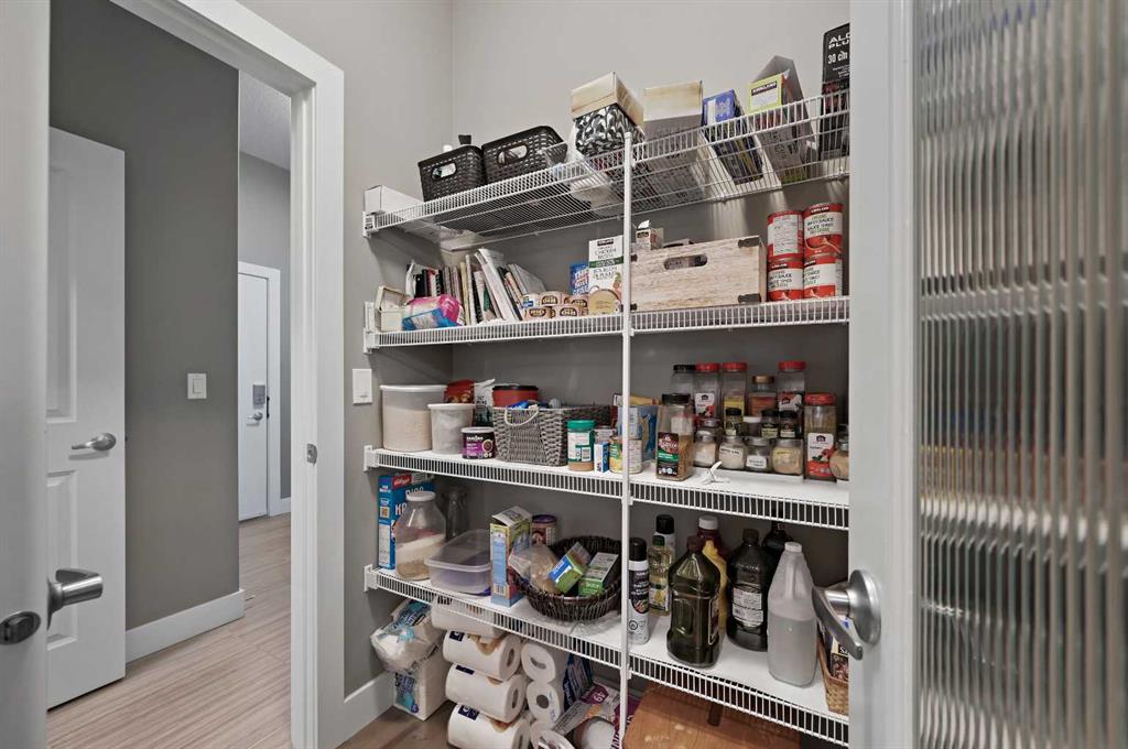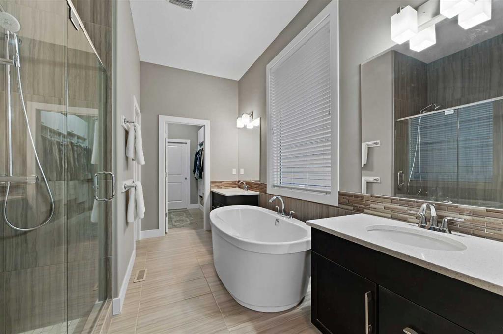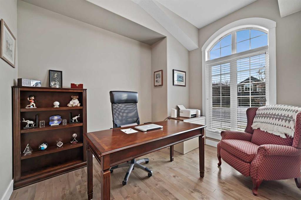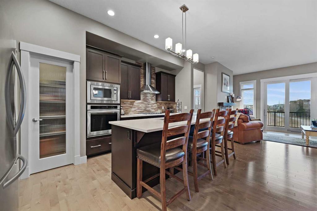 Step inside and be impressed by 10-foot ceilings and oversized windows with Vista Solar Film, which flood the home with natural east-facing morning light. The heart of the home is the chef’s kitchen, featuring timeless maple shaker-style cabinetry, oversized central island with undermount granite sink and flush eating bar, white quartz countertops, a gas cooktop, a built-in wall oven, a pantry, and sleek stainless-steel appliances. The kitchen flows into the large dining area, opening to the grand living room with soaring ceilings, a gas fireplace, patio doors to the upper deck and expansive views of the pond and natural areas. Gleaming hardwood floors and a staircase with wood railing add a sense of elegance and warmth throughout. The spacious primary suite offers 10' ceilings, a walk-in closet with California Closet built-ins, and a spa-inspired ensuite with a stand-alone soaker tub, separate oversized tile shower with 10 mil glass doors and dual vanities. The main floor den/office is featured at the front entry with views to the west. The fully developed walkout lower level features two additional bedrooms, a recreation room with a wet bar, a full bath, and an oversized utility/storage room, a tankless water heater—all perfect for family living and entertaining. Step outside to your very own private oasis with an upper BBQ deck, a lower concrete patio pavers, a custom shed, a large grassy area, and mature landscaping with trees that offer beauty and privacy. The east-facing backyard is designed for relaxation and entertaining.
