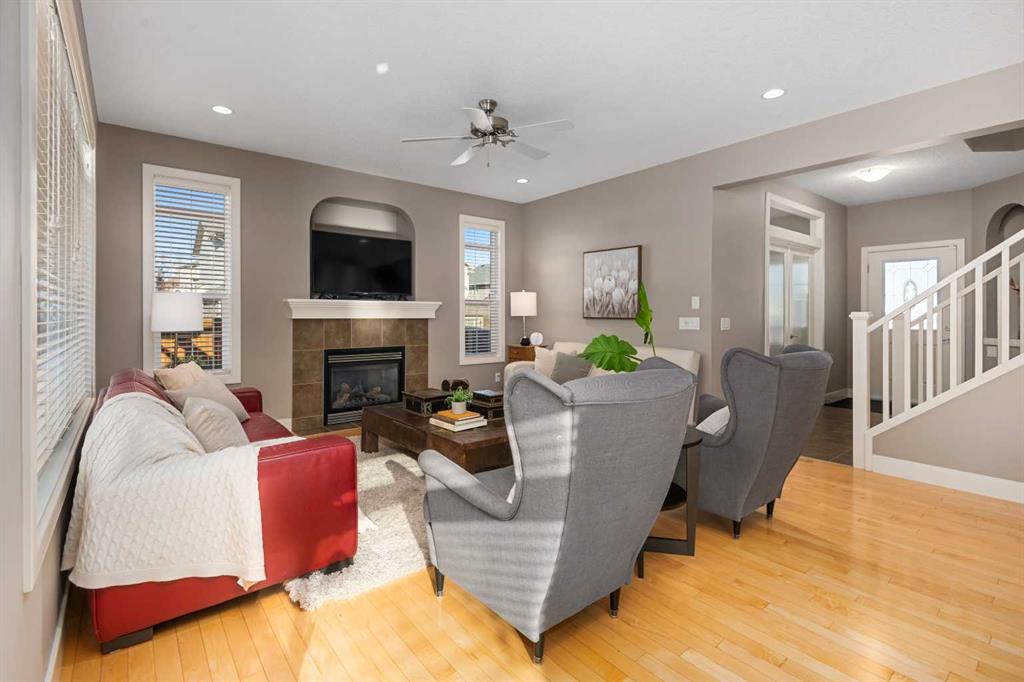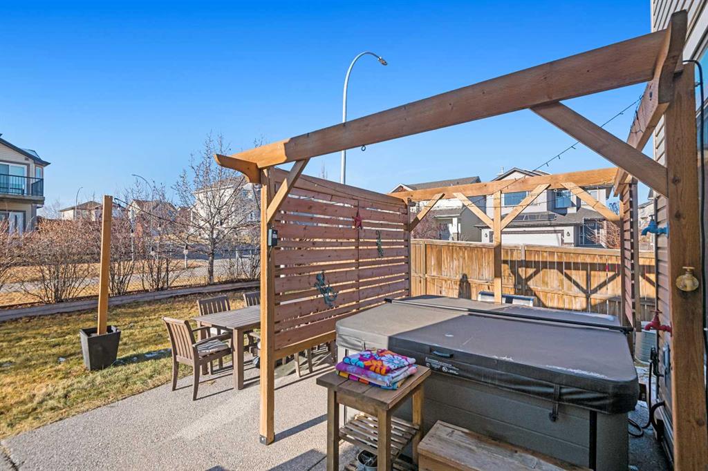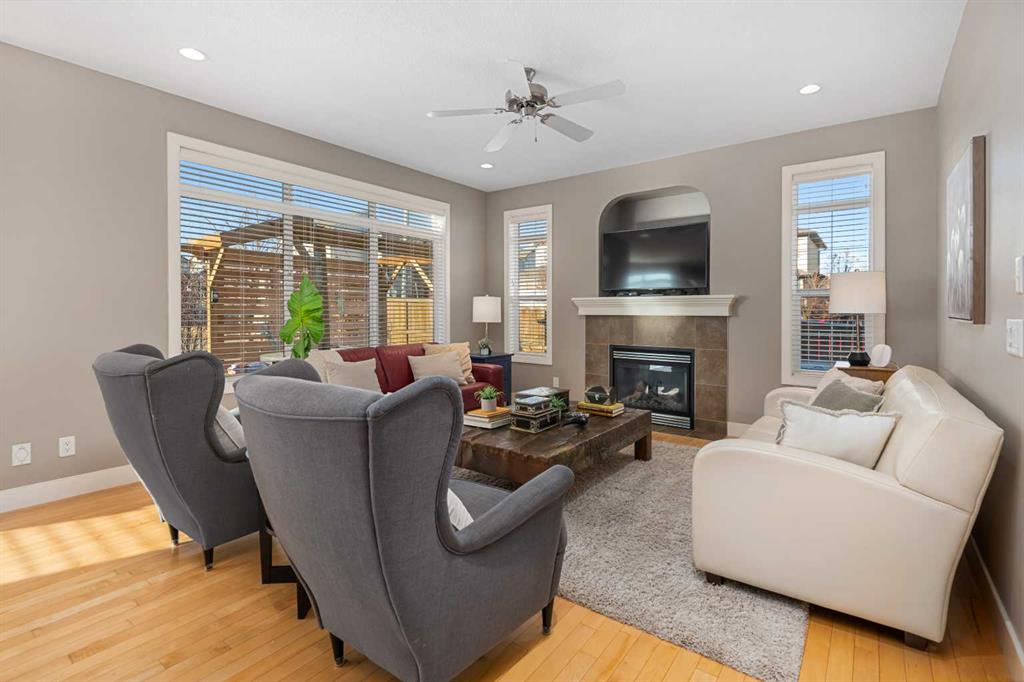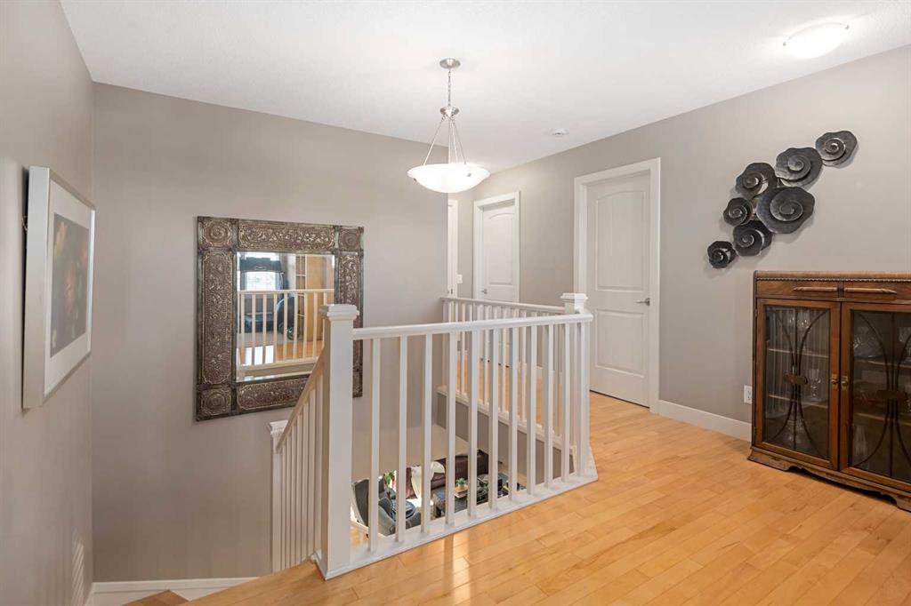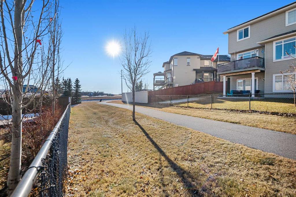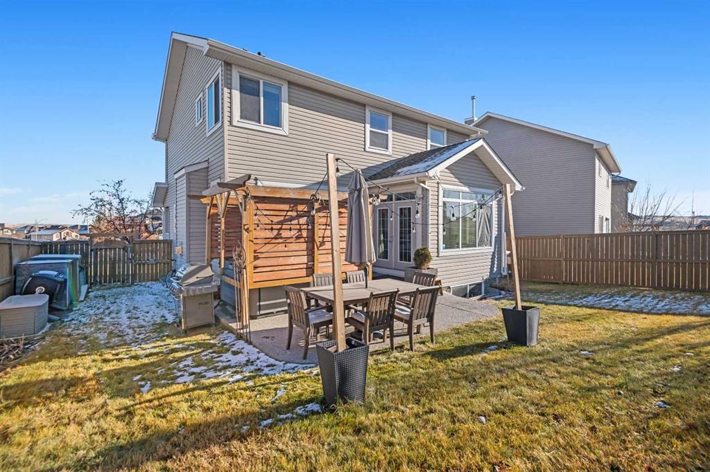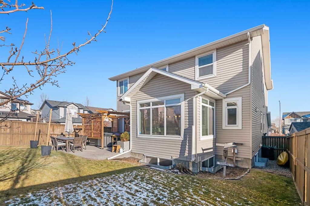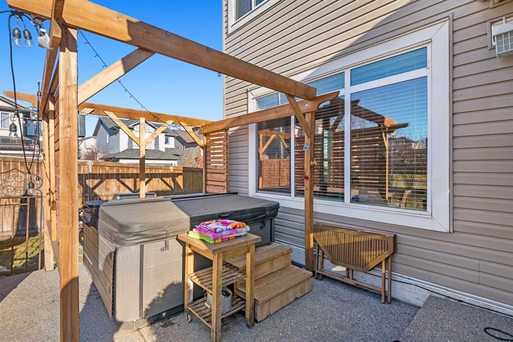 An expansive living room with large windows and gas fireplace creates a cozy space on a chilly evening. You will appreciate the white kitchen, equipped with upgraded cabinets, quartz countertops, stainless steel appliances and under-counter task lighting. There is plenty of counter space and cupboards as well as a pantry. The breakfast bar is a great place to relax over morning coffee. The adjoining dining area features more oversized windows with mountain views. The dining room overlooks the private backyard, where trees and shrubs offer added privacy. The West backyard is great for entertaining, complete with a pergola and concrete aggregate patio. Unwind after a long day in the hot tub. The functional, thoughtfully designed main floor also features a convenient laundry room and a powder room. The second floor bonus room is bathed in natural light and features vaulted ceilings. The primary bedroom is a true sanctuary, with another vaulted ceiling, a spacious layout with large walk in closet and an 5-piece ensuite bathroom. Indulge in the double vanities with quartz counters, a double shower with a bench, and a relaxing corner soaker tub. Two additional kid-friendly bedrooms and a well-appointed 4-piece bathroom complete this level, along with extra storage options provided the linen closet and a dedicated storage closet in the main bath. The unfinished basement presents a blank canvas, offering lots of storage space and the perfect opportunity to create the additional living area of your dreams! You’ll love the impressive upgrades throughout, including crown mouldings, 9-foot ceilings, and hardwood floors. There is a new, high efficiency furnace to keep you comfortable this winter and 5 large windows in the basement. This lovely family home has an ideal location, backing onto a walking path, and is just minutes away from schools, playgrounds, green spaces, and convenient shopping options. Experience the perfect blend of comfort, style, and functionality. Quick possession is possible.