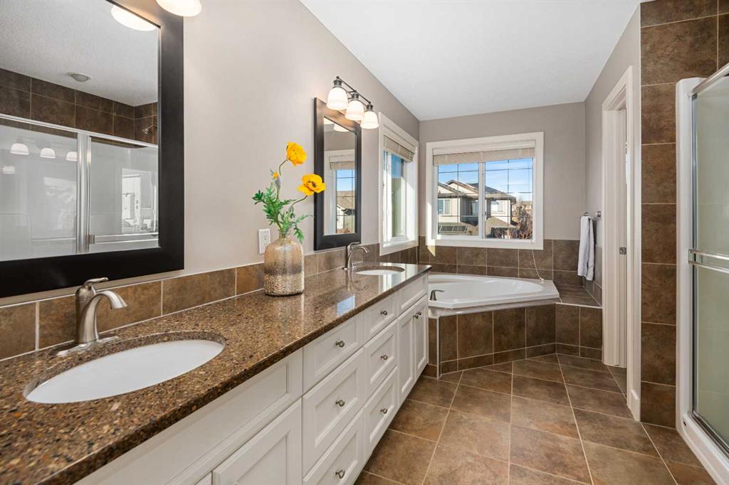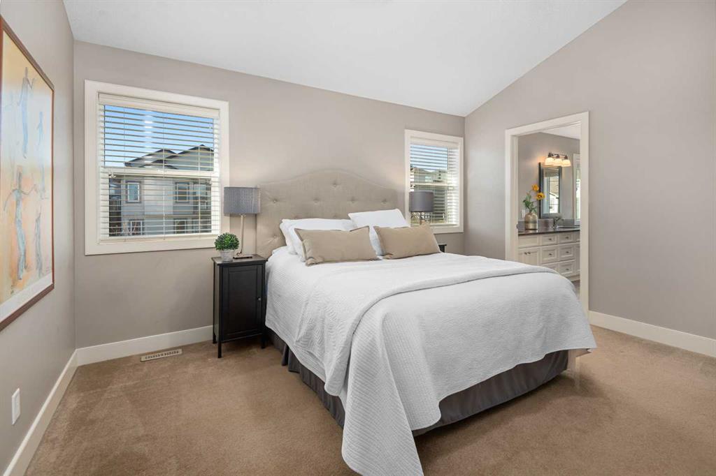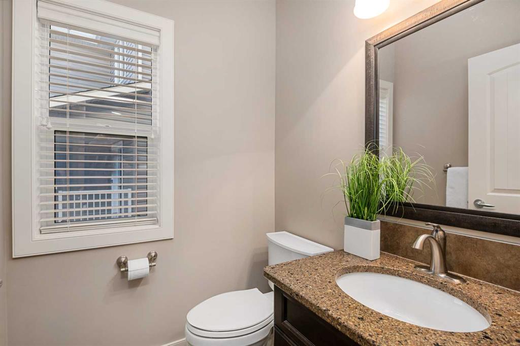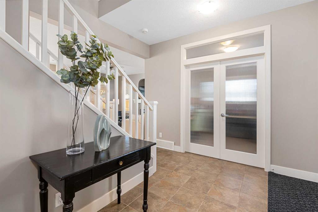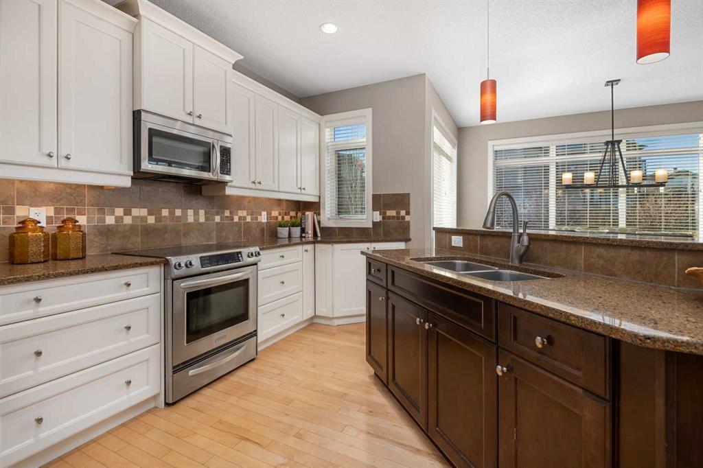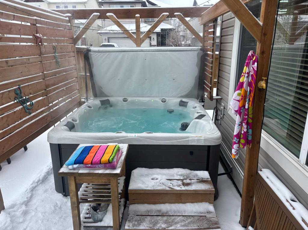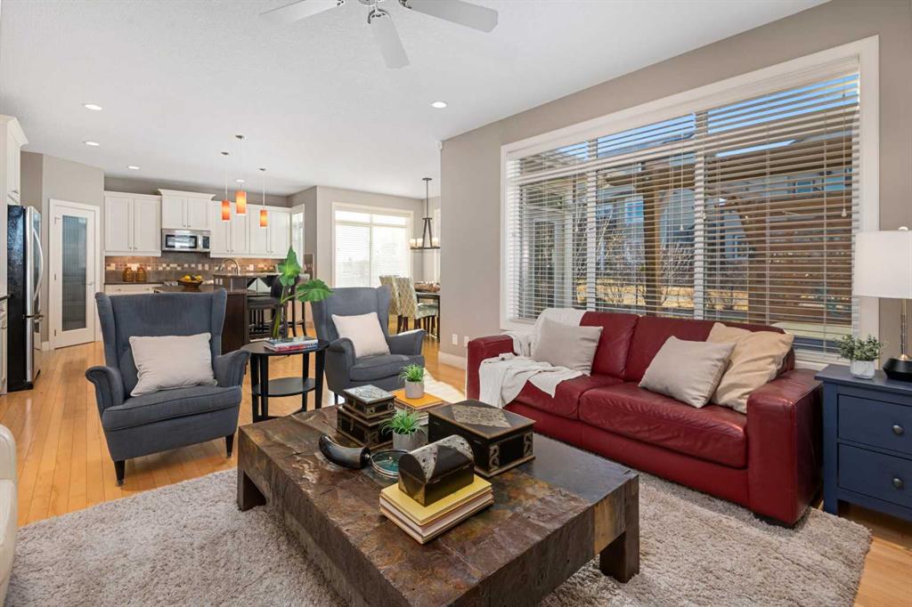 An expansive living room with large windows and gas fireplace creates a cozy space on a chilly evening. You will appreciate the white kitchen, equipped with upgraded cabinets, quartz countertops, stainless steel appliances and under-counter task lighting. There is plenty of counter space and cupboards as well as a pantry. The breakfast bar is a great place to relax over morning coffee. The adjoining dining area features more oversized windows with mountain views. The dining room overlooks the private backyard, where trees and shrubs offer added privacy. The West backyard is great for entertaining, complete with a pergola and concrete aggregate patio. Unwind after a long day in the hot tub. The functional, thoughtfully designed main floor also features a convenient laundry room and a powder room. The second floor bonus room is bathed in natural light and features vaulted ceilings. The primary bedroom is a true sanctuary, with another vaulted ceiling, a spacious layout with large walk in closet and an 5-piece ensuite bathroom. Indulge in the double vanities with quartz counters, a double shower with a bench, and a relaxing corner soaker tub. Two additional kid-friendly bedrooms and a well-appointed 4-piece bathroom complete this level, along with extra storage options provided the linen closet and a dedicated storage closet in the main bath. The unfinished basement presents a blank canvas, offering lots of storage space and the perfect opportunity to create the additional living area of your dreams! You’ll love the impressive upgrades throughout, including crown mouldings, 9-foot ceilings, and hardwood floors. There is a new, high efficiency furnace to keep you comfortable this winter and 5 large windows in the basement. This lovely family home has an ideal location, backing onto a walking path, and is just minutes away from schools, playgrounds, green spaces, and convenient shopping options. Experience the perfect blend of comfort, style, and functionality. Quick possession is possible.
