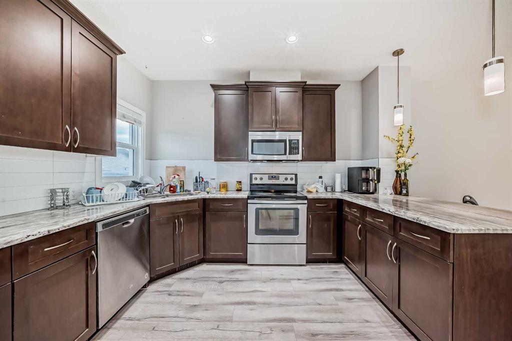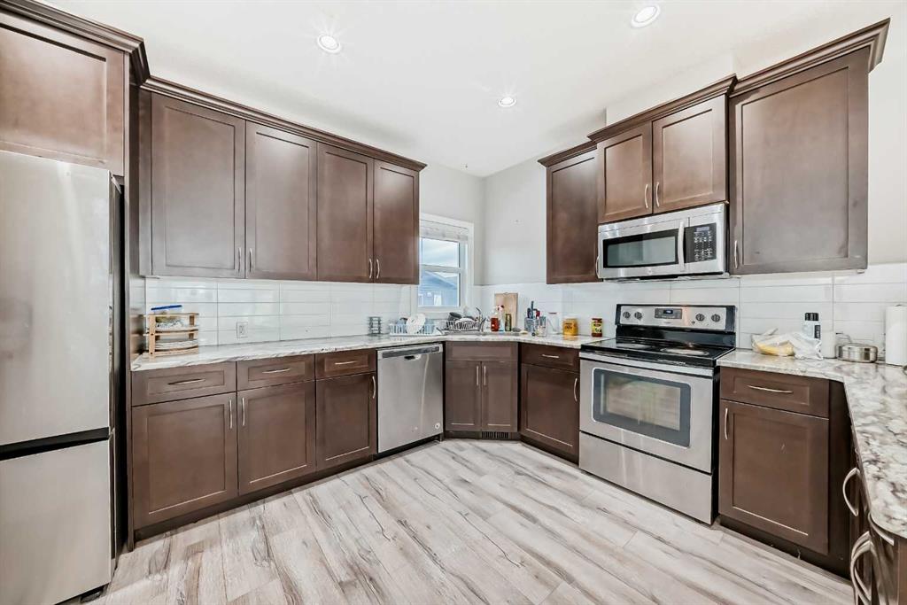 PERFECT LOCATION WITH LEGAL BASEMENT-Welcome to this beautiful single-family home located in the heart of Cornerstone—one of Northeast Calgary’s most desirable communities. This well-maintained property features a fully LEGAL BASEMENT SUITE and an oversized DOUBLE DETACHED GARAGE, offering exceptional value for families, investors, or first-time homebuyers. The main floor features an open-concept layout designed for comfort and style. Enjoy a bright, spacious living room that flows into a modern kitchen equipped with stainless steel appliances, a large island, and ample cabinet space perfect for cooking, hosting, and everyday living. At the rear, a fully developed deck provides a low-maintenance outdoor space ideal for relaxation and gatherings, with easy access to the double garage. Upstairs, you will find three generous bedrooms and two full bathrooms, including a well-appointed primary suite. A convenient upper-floor laundry room adds to the home's practicality. The legal basement suite, complete with its own separate side entrance, includes two additional bedrooms, a full bathroom, a functional kitchen, and a spacious recreation area—ideal for extended family or rental income opportunities. Located just minutes away from parks, bus stops, and shopping centers, this home offers both comfort and convenience in a vibrant, growing community. Don’t miss your chance to own this spacious, versatile, and beautifully maintained home in Cornerstone!