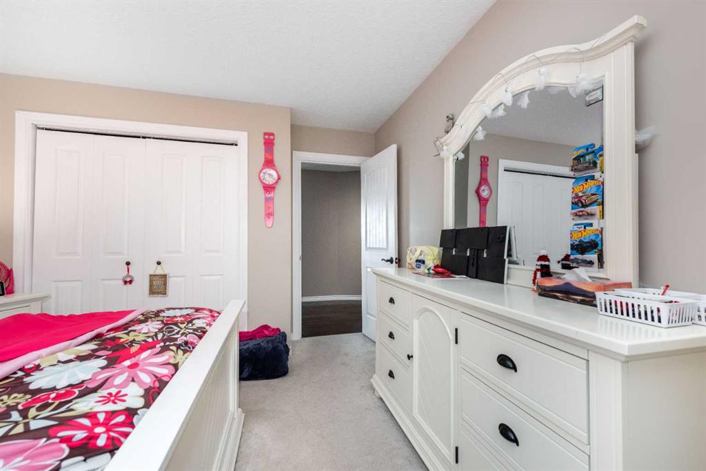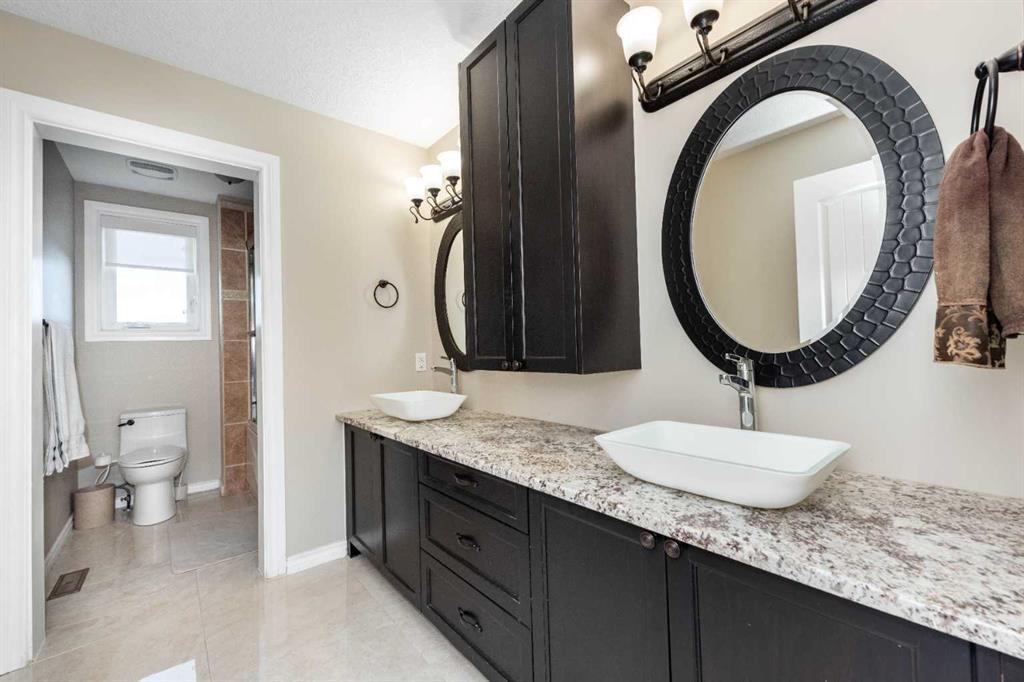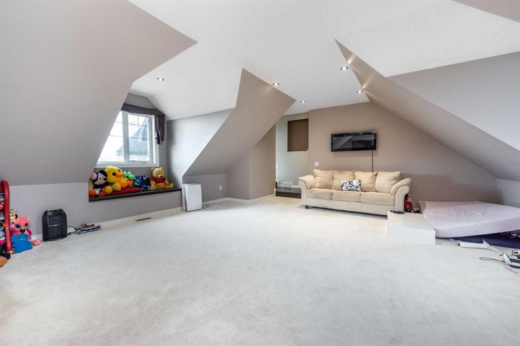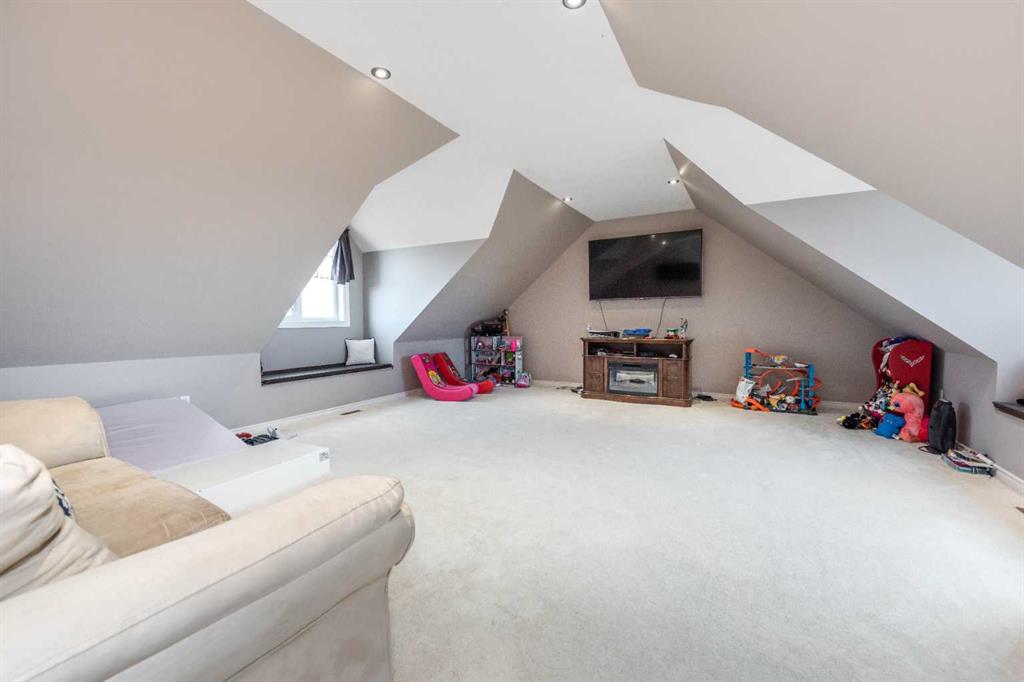 Upstairs, you’ll find three generous bedrooms and a large family room with lofted ceilings that elevate the home’s spacious feel. The primary suite is a true retreat, offering a private west-facing balcony with mountain views. The luxurious 5-piece ensuite includes a deep soaking tub set against a stunning window backdrop, a tiled steam shower with bench seating, dual vanities, and a private water closet. The custom walk-in closet provides exceptional storage and organization. Bedrooms 2 and 3 share a well-appointed 5-piece bathroom with dual sinks and a separate shower/tub and toilet area—ideal for busy families.