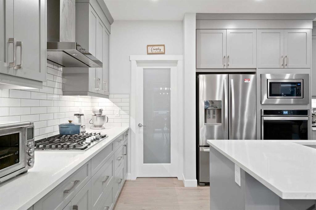 A covered front entrance welcomes you inside to a bright, open-concept main floor where warm luxury vinyl plank flooring flows seamlessly throughout. The heart of the home is the upgraded chef’s kitchen, showcasing stainless steel appliances, a gas cooktop, built-in oven and microwave, double-door fridge, ceiling-height cabinetry and an expansive island. The open layout connects the kitchen, dining and living areas effortlessly, with large windows filling the space with natural light. A cozy fireplace adds warmth on cooler days, while the walk-through pantry from the garage with a privacy door keeps daily life organized.