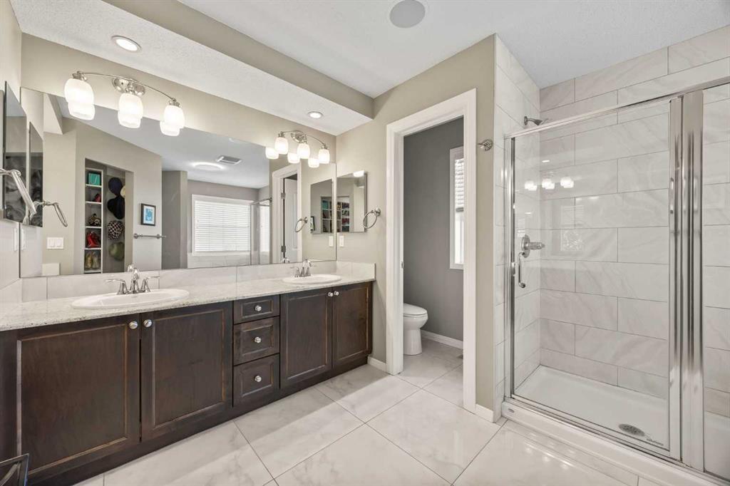 Upstairs, the primary suite is a private retreat, offering a generous walk-in closet and a spa-inspired 5-piece ensuite with dual vanities, a soaker tub, separate shower, and a dedicated makeup area—perfectly positioned for your morning routine or a quiet moment of luxury. Two additional bedrooms share a spacious 4-piece bath, while the bonus room offers flexible living space—complete with custom built-in bookshelves and additional storage - perfect as a media lounge, playroom, or second office. The upper-level laundry room—with sink and built-in cabinetry—adds an extra touch of convenience.
