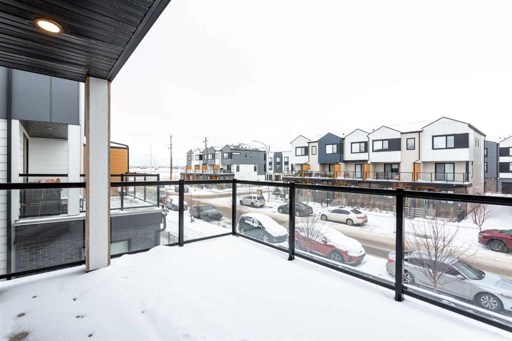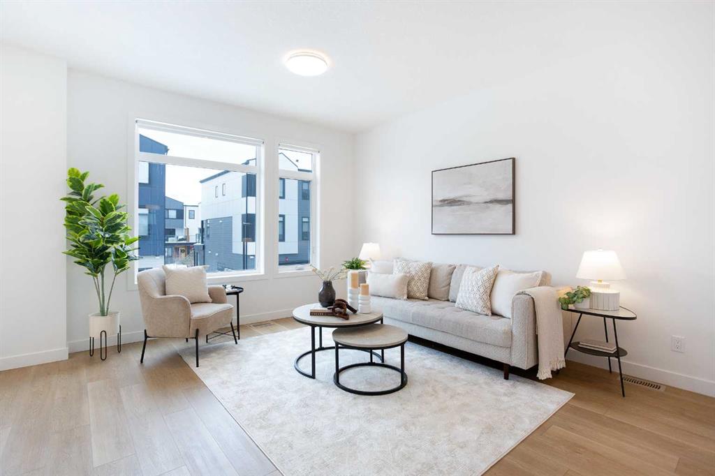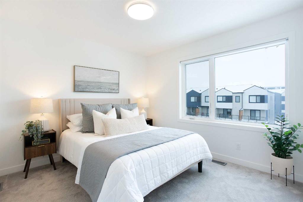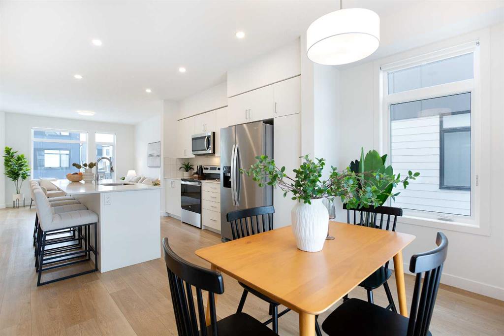 Step into a world where sophistication seamlessly meets everyday comfort in this remarkable contemporary townhome. Boasting over 1,634 sqft spread across three impeccably designed levels, this residence features three spacious bedrooms and two and a half bathrooms, offering an environment of refined, turn-key living. The moment you enter the welcoming foyer, you are greeted by a beautiful main floor living room, bathed in an abundance of natural light. This ground floor ensures ultimate functionality, featuring a generously sized coat closet, utility room, and a practical mudroom that provides direct, access to your convenient double attached garage. Upstairs, discover the heart of the home - a bright and open haven for both daily life and entertaining. The family room provides an idyllic setting and offers a bright and inviting ambience. The stunning, modern kitchen showcases sleek countertops, ample cabinetry, and is anchored by a large center island that provides comfortable seating for four. This culinary space flows effortlessly into the generously sized dining room. Extending your living space outdoors is a sunny balcony located just off the dining area—the perfect spot for enjoying your morning coffee or hosting summer evening gatherings. For the convenience of your guests, a stylish two-piece powder room completes this impressive main entertaining level. The private upper level is dedicated to peaceful relaxation. The flooring transitions to plush carpeting, creating a tranquil environment for the three spacious bedrooms. The primary suite is a true retreat, featuring a private three-piece ensuite and a dedicated walk-in closet. The two additional great-sized bedrooms, each with ample closet space, share a well-appointed four-piece main bathroom, plus an essential addition to this floor is the conveniently located upper-level laundry room. Beyond the elegant interior, this home offers superb comfort and convenience, including central air conditioning, parking for 4, plus a storage room within the garage. Designed for those who value style, comfort, and unparalleled convenience, this home checks all the boxes. Set in Belvedere—one of Calgary’s most exciting and fast-growing neighborhoods, you are placed moments from everything you need. Whether you’re a first-time buyer, growing family, or investor, this property is a must-see so book your showing today!