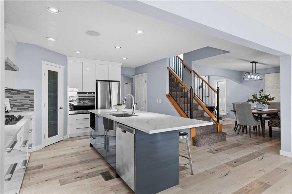 Nestled in desirable Rocky Ridge, this beautifully updated two-storey walkout invites you into a lifestyle defined by comfort, elegance, and connection to Calgary’s northwest landscapes. With over 3,200 sq. ft. of developed and lovingly maintained living space, four bedrooms, and three and a half bathrooms, this residence blends modern upgrades with thoughtful design, creating a home that feels both luxurious and welcoming from the moment you step inside. The main level showcases a fully renovated kitchen that serves as the heart of the home. Redesigned with quartz countertops, full-height backsplash, custom cabinetry with pull-out drawers, premium stainless-steel appliances, and a built-in wall oven, it offers an elevated space for cooking, entertaining, and gathering. The kitchen opens to a bright dining nook and a warm family room centered around a gas fireplace, forming an inviting setting for everyday living. At the front of the home, a second living room and a formal dining area add sophistication and versatility, ideal for hosting holiday dinners, celebrations, or intimate evenings with friends. A stylish 2-piece powder room and a functional mudroom with laundry and garage access enhance the convenience of the main floor. Upstairs, the primary retreat is designed for relaxation, capturing calming mountain views that shift beautifully with each season. The fully renovated 5-piece ensuite evokes a spa-like atmosphere with its thoughtful finishes, offering a peaceful escape at the end of the day. Two additional bedrooms and another full bathroom complete the upper level, providing excellent comfort for family or guests while maintaining a sense of privacy and balance throughout the floor. The fully developed walkout basement extends the home’s luxurious feel with a spacious media room featuring built-in cabinetry, a wet bar with sink, and a second gas fireplace. A dedicated games area adds versatility, while an additional bedroom and full bathroom make this level ideal for hosting, multigenerational living, or weekend visitors. Large windows and direct yard access enhance the sense of openness and connection to the outdoors, creating a warm and inviting extension of the living space. Outdoor living is exceptional, with both an upper deck and a lower patio equipped with gas lines for year-round grilling, heaters, or fire features. The walkout design provides a seamless transition to the yard and invites you to relax, entertain, and enjoy the peaceful surroundings, whether savoring quiet mornings or gathering with friends on warm summer evenings. Living in Rocky Ridge means embracing a highly desirable community lifestyle, quiet streets, scenic pathways, stunning natural outlooks, and access to the Rocky Ridge Ranch amenities including tennis courts, playgrounds, and recreational programs. Proximity to the C-Train, schools, parks, shopping, and the striking foothills of Calgary’s northwest enriches everyday life, offering both convenience and a sense of retreat.