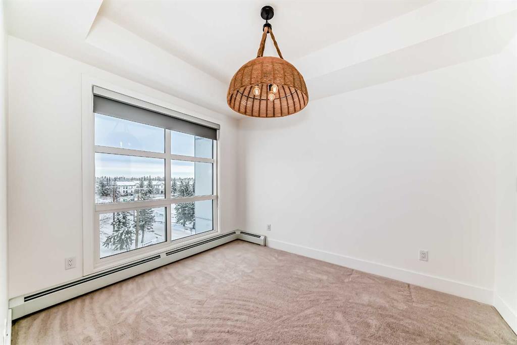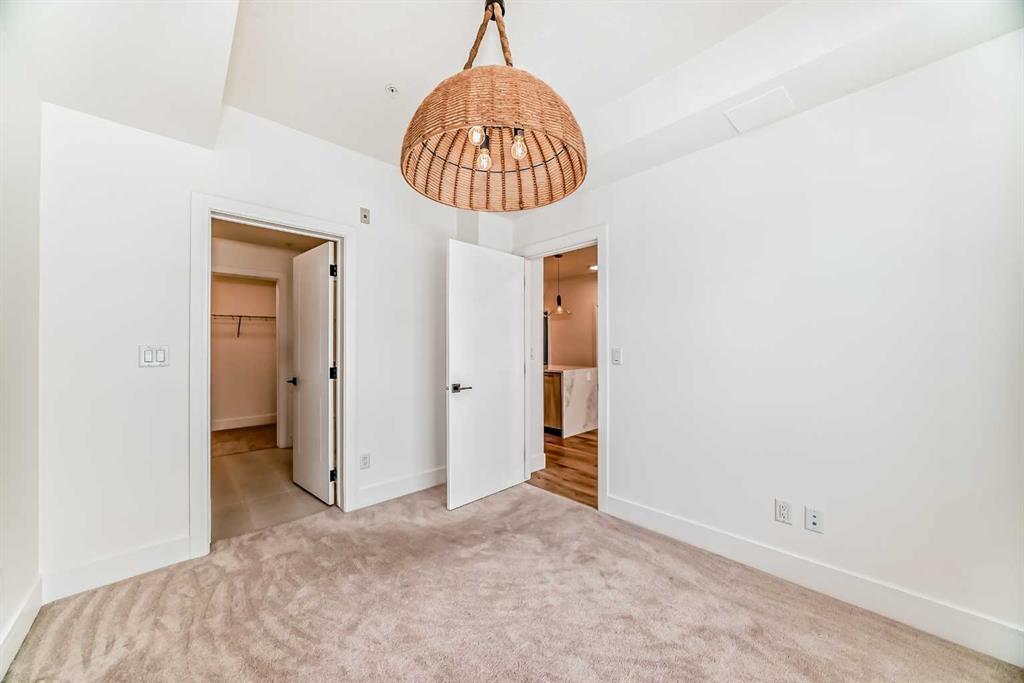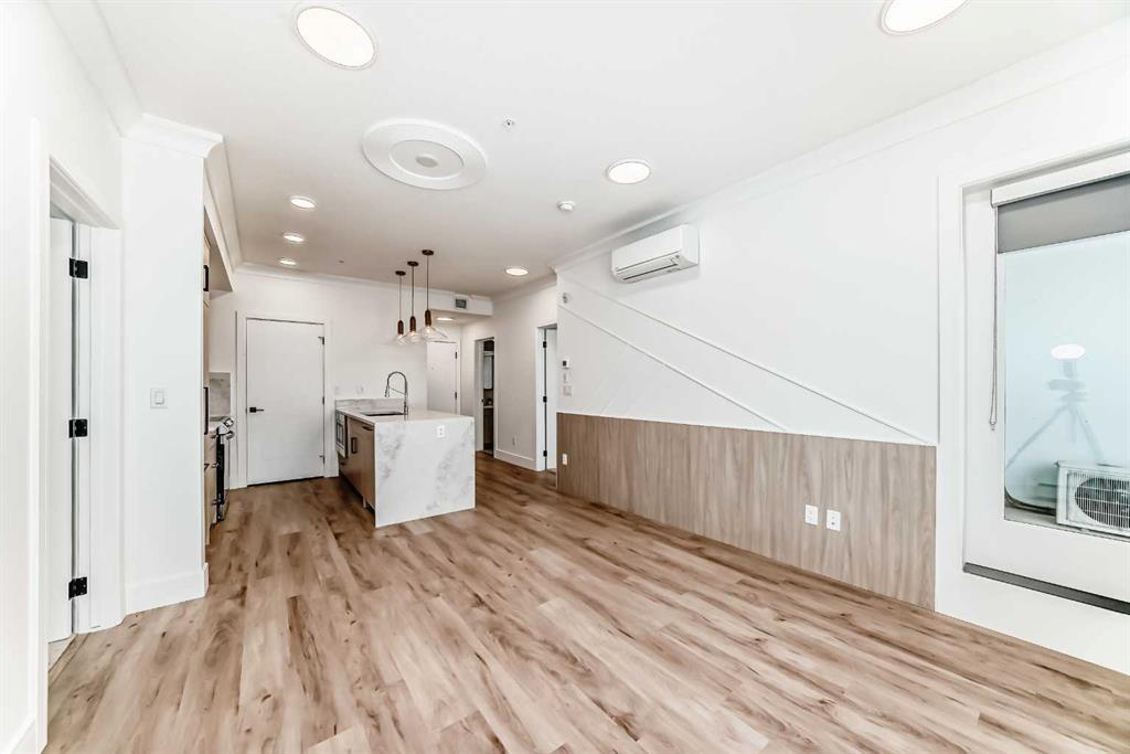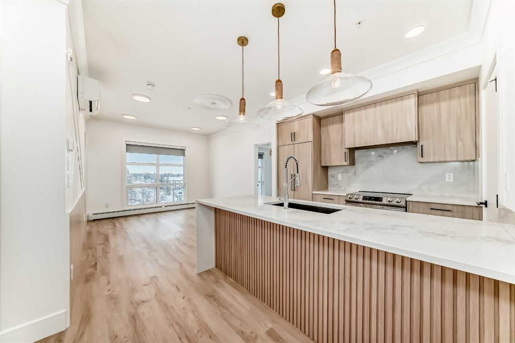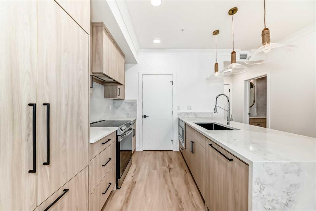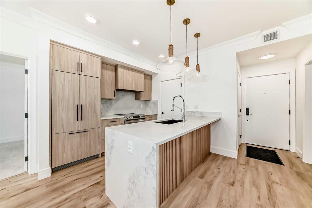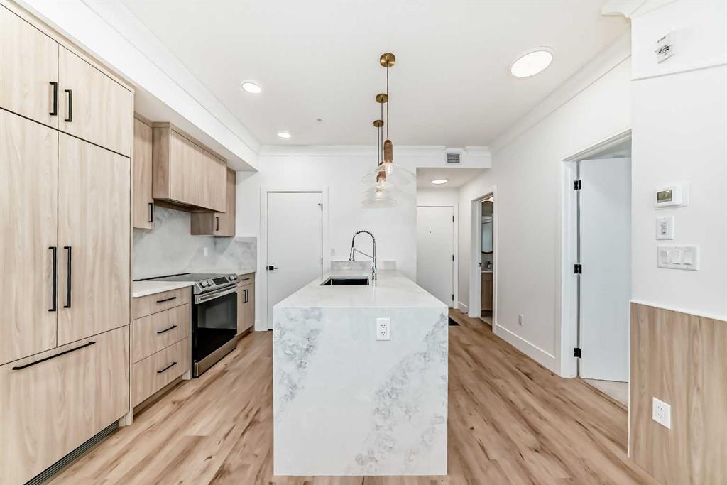 Welcome to the Quesnay in Calgary's historic Currie Barracks, a community built with a walkable urban design, heritage sites, bike paths, green spaces and dog parks, all minutes from the downtown core. This 2 bed, 2 bath offers an elevated living experience with unobstructed VIEWS of the DOWNTOWN SKYLINE and a front row seat to epic Calgary sunrises. The kitchen showcases a quartz waterfall countertop and panelled Fisher Paykel appliances, custom light fixtures and a designer feature wall. A private covered balcony, CENTRAL AIR CONDITIONING, titled underground parking stall and titled storage locker for comfortable, convenient living. Check the comparables, this one is priced to sell. Immediate possession.