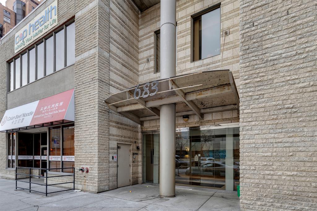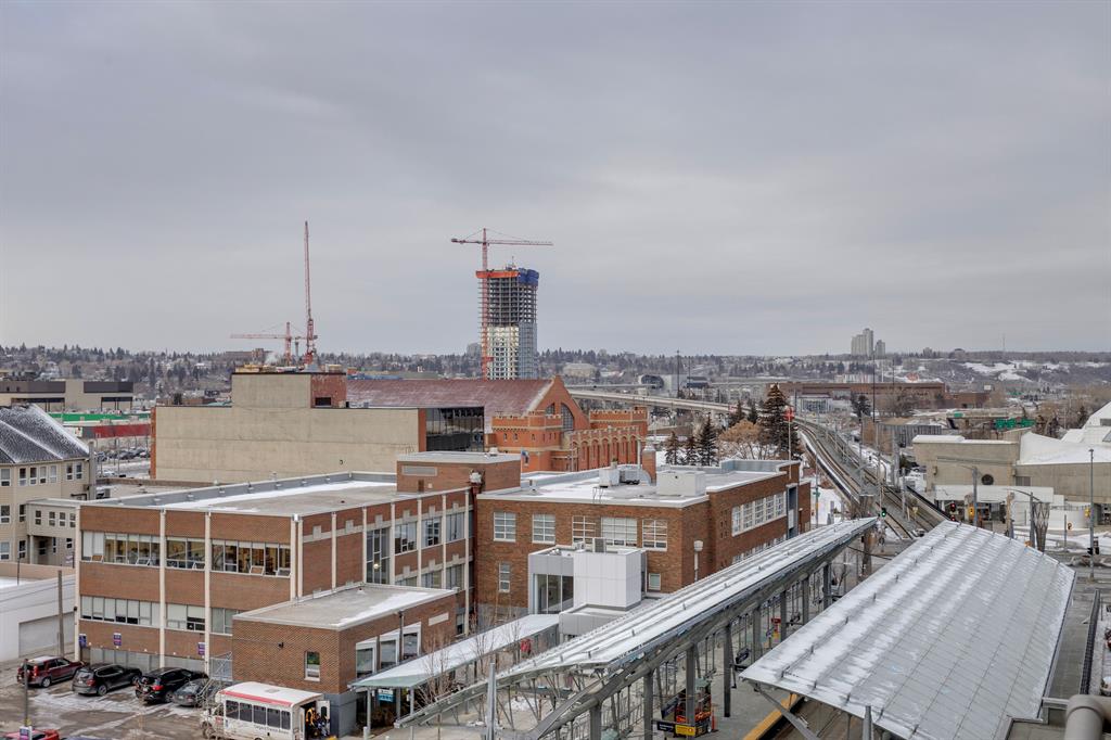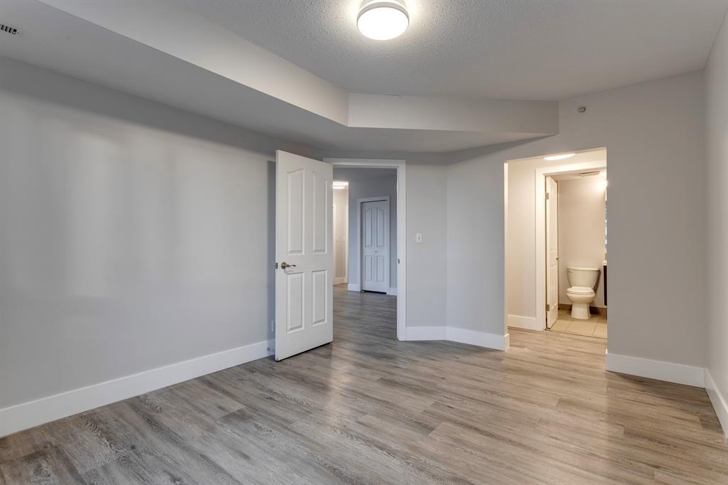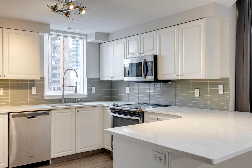 Available for immediate Possession! Freshly painted, substantially renovated 2 bedroom, 2 bathroom corner unit in Downtown West End. Very spacious, open concept with bright sunny west exposure & lovely river valley plus downtown views. Low maintenance laminate flooring throughout. Large peninsula kitchen with modern white cabinetry, quartz countertops, breakfast bar, stainless appliance package & a lovely window over the kitchen sink! Steps to the C-train free fare zone. This building offers security, concrete construction, underground parking plus fitness room. Walk to Kensington in 10 minutes, enjoy the Bow River pathway, restaurants and shops.