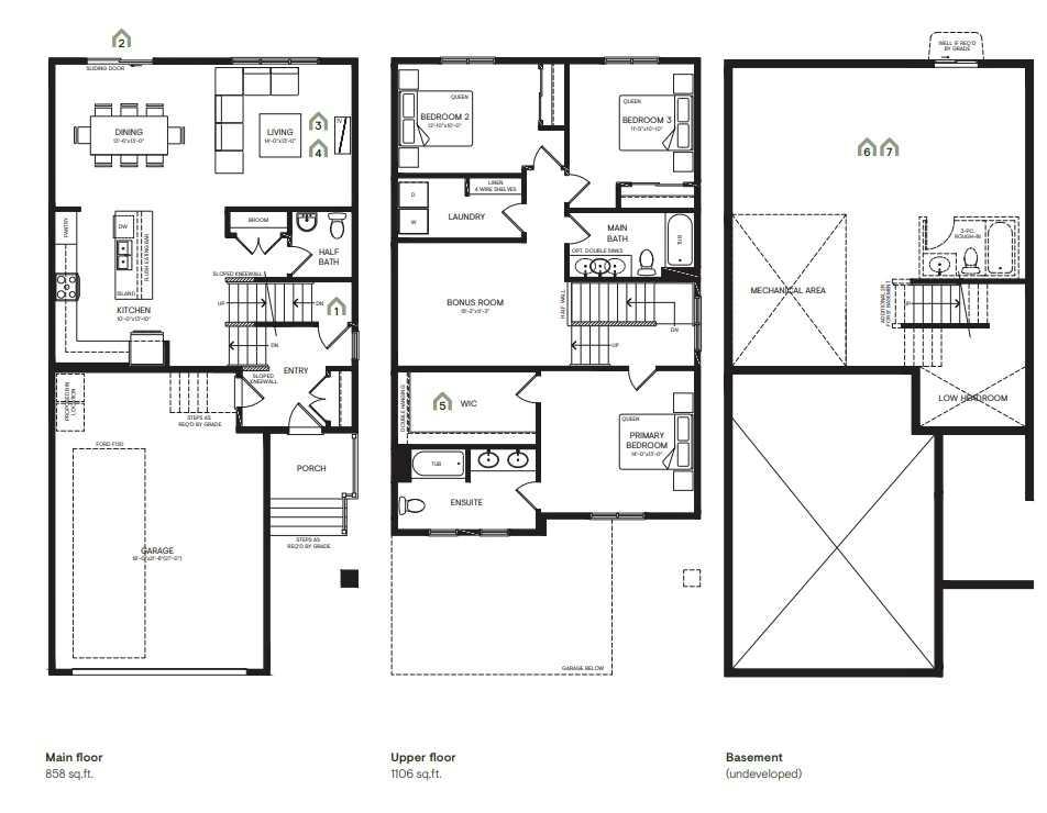 Welcome to the Marigold 3! This beautifully designed 4-bedroom, 2.5-bathroom home offers the perfect blend of comfort and style, ideal for growing families or those who love to entertain. The primary ensuite comes with a tiled standing shower, while the additional bonus room provides the flexibility for a home office, playroom, or media space. The open-concept main floor features upscale finishes, including a chimney-style hood fan, kitchen cabinets to the ceiling, a built-in microwave, gas rough in's for the stove and railings leading to the second floor, adding a touch of elegance throughout. Thoughtfully laid out with both function and flow in mind, the Marigold 3 offers a modern living experience in every corner. Photos are representative.