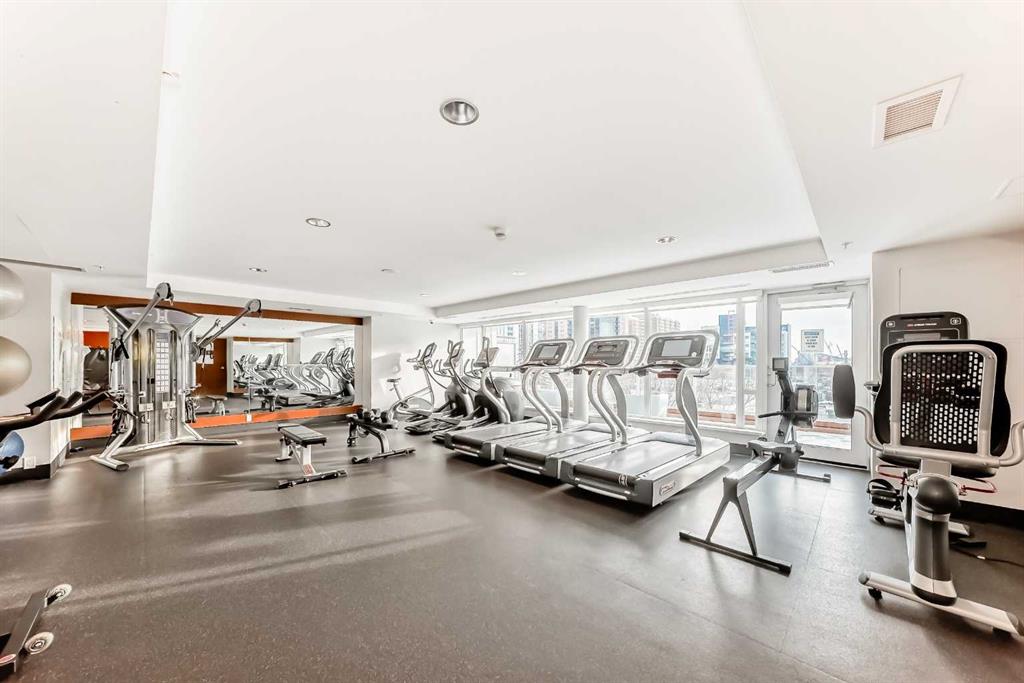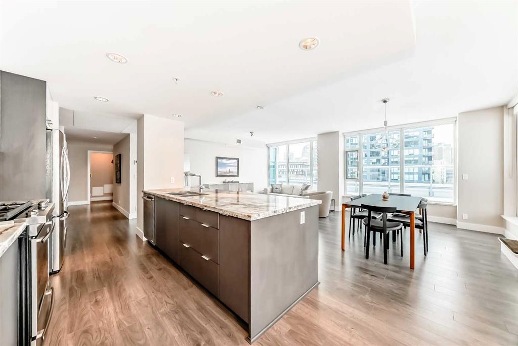 Over 1400 sqft of luxury living plus your very own oversized private roof top patio overlooking the river, sunset sky and the Calgary Tower's night lights. Welcome to one of Calgary's newest and best built high rise condos with concierge, the Evolution. This unit is practically brand new because it was only ever lived in for approximately 2 weeks a year, since it was built. A large and refined two bedroom, two bathroom end corner unit has beautiful west sunset views, views of the Calgary Tower as well as river views from the large wrap around roof top patio. Perfect for entertaining, enjoying the sunshine, hosting parties, relaxing on summer nights and bbq-ing while enjoying the sky line from this private roof top patio. This open concept unit boasts spacious dining, living, lounging and kitchen areas with a granite natural stone island that provides lots of extra counter space for cooking and dining and top of line appliances and accessories such as a Jenn-Air gas stove and brand new Frigidaire fridge. The two good sized bedrooms face west, over looking the city and horizon and are complemented by their own exquisite bathrooms. The master has his and her closets and a beautiful spa like five piece en-suite with over sized soaker tub for relaxing and rejuvenating. With many built ins, upgrades, fine finishings, in suite laundry, two parking stalls and storage, this unit has it all. The common areas also provide for an additional roof top garden area with dining and lounging areas equipped with bbq, a party / recreation room with pool table and full kitchen. Across the hall from the party room is the fitness room with many new workout machines and sauna. Call to book your private viewing of the East Village's Evolution today!