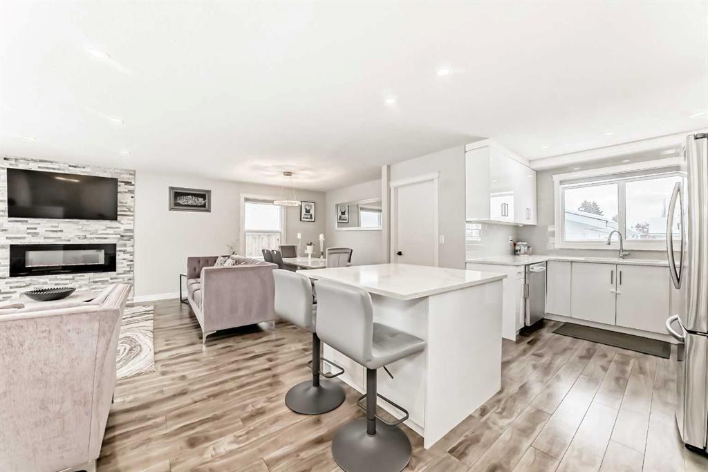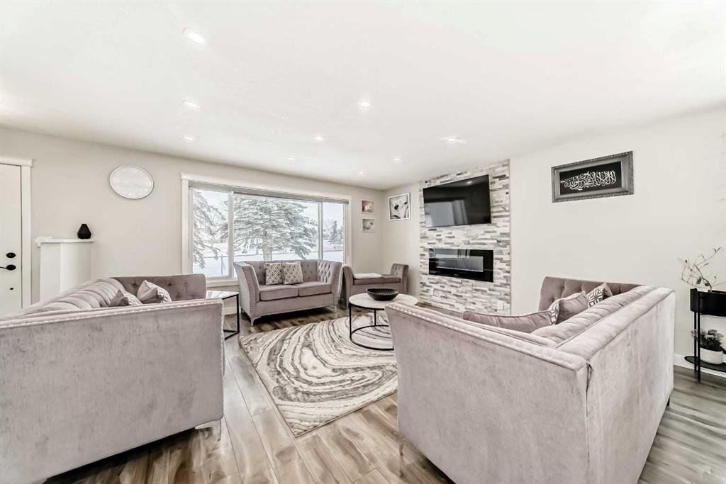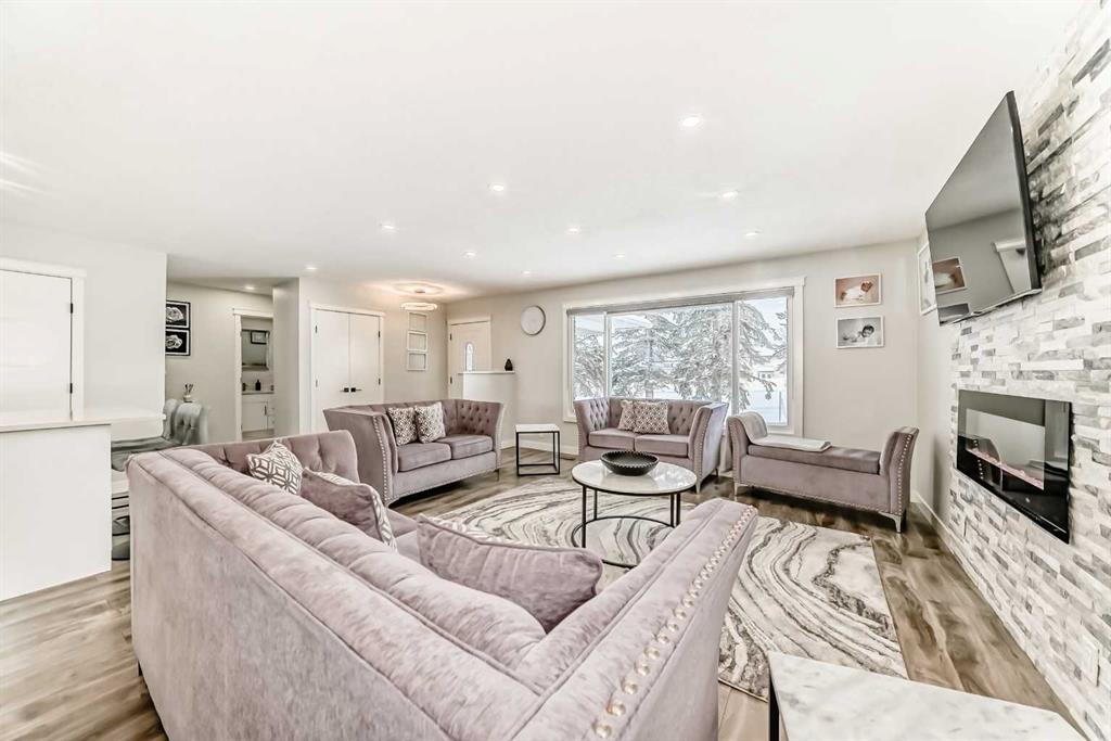 Step into the inviting living room, where a stunning stone feature wall with an electric fireplace. New Kitchen, new flooring, fresh paint, upgraded doors and baseboards, and new windows create a bright, cohesive space perfect for relaxing or entertaining.