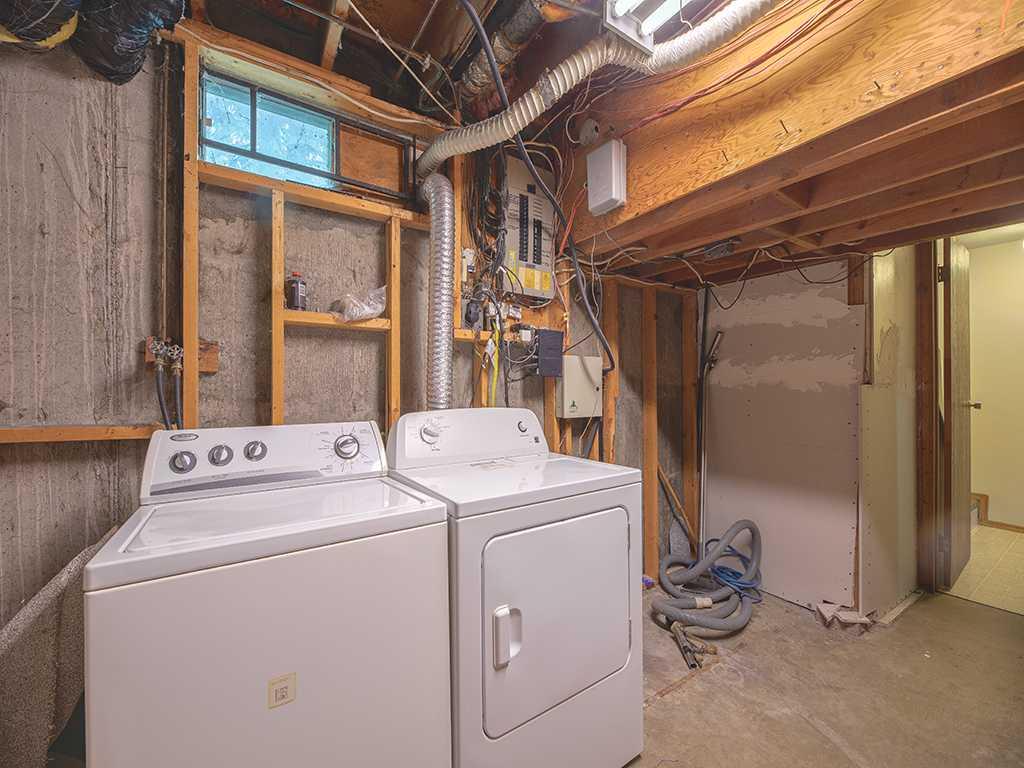 The basement houses the private, legalized secondary suite, brightened by high windows that let in natural light. This suite serves as a mortgage helper or rental income option, with a generous one-bedroom layout, a private bathroom featuring a modern one-piece surround bathtub, and a spacious kitchen and eating area with a keyhole feature connecting to the large living room. The basement also includes shared laundry and storage space for added convenience.