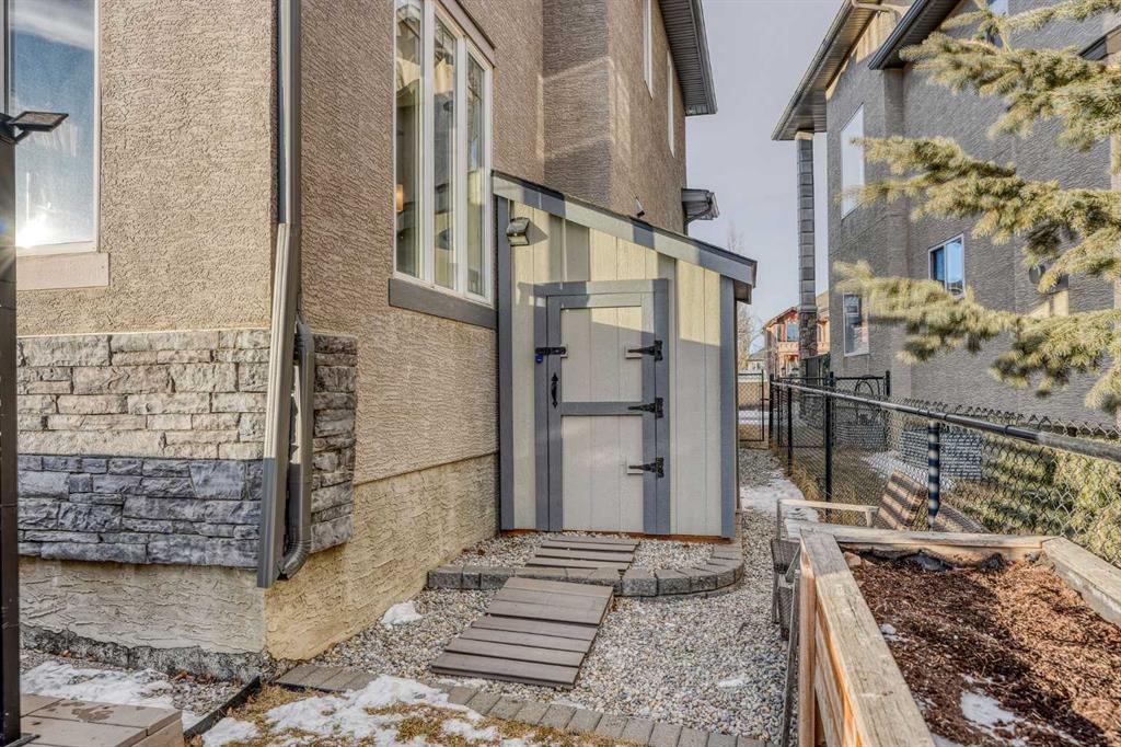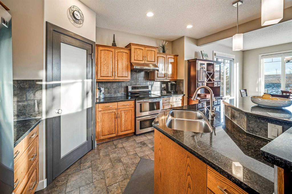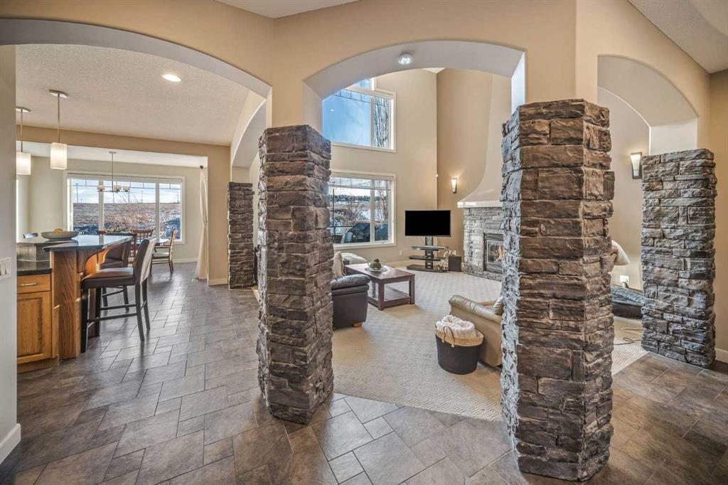 A story-book family home where nature, design, and thoughtful living come together. Offering 5 bedrooms, over 3,500 sqft of developed living space, air conditioning, soaring ceilings, and an open floor plan, this residence is defined by its unbeatable location and timeless backdrop. With no homes behind, enjoy valley views where sunrises, sunsets, and occasional Alberta wildlife become part of daily life in this peaceful nature escape. Tucked quietly into a cul-de-sac with wonderful neighbours, the curb appeal immediately captivates. A new copper entry awning welcomes you inside, equal parts beauty and function while adding character. The spacious front entry offers a large closet and weaves into a private home office with french doors, ideal for work or study. From here, the home opens into the heart of the space, a grand living room anchored by a towering fireplace, stone clad columns, graceful arches, and a wall of expansive windows dressed with Hunter Douglas dual roller shades. Soaring ceilings and a lofted overlook give architectural presence without feeling showy. The open kitchen features quartz counters, stainless appliances, a raised breakfast bar for casual meals or cocktails with friends, and a large corner pantry. Adjacent, the roomy dining nook is wrapped in windows with spectacular ridge views, creating the perfect setting for everyday meals and celebrations alike. Upstairs, balcony views lead you into the primary retreat, spacious enough for a king and featuring a cozy gas fireplace. Two walk-in closets, a linen closet, and a spa inspired ensuite await, complete with double vanities, private toilet, glass shower, and a corner soaker tub perfectly positioned to take in the valley views. Blackout drapes ensure restful sleep. Two additional generous bedrooms share a rare full bath with dual vanities and private toilet, a layout designed for real life. The fully developed lower level is built for entertaining with two spacious bedrooms (one with walk in closet), a full bathroom, and a dry bar with fridge and microwave. There is space for a gym, games, and a cozy theatre nook and in-floor heating on the tiled floor to keep your tootsies warm. Back upstairs, the mudroom and laundry area shine with custom built ins, storage benches, handy hooks, SINK, folding counter, and new washer and dryer, connecting seamlessly to the double attached garage with abundant shelving and storage. The south facing backyard is a showstopper, backing onto an environmental ravine with breathtaking views and ever changing skies. Relax in the hot tub, host dinner parties on the large vinyl deck with twinkle lights, or stargaze around the outdoor fireplace. The fenced yard features perennials, lilacs, garden box, a custom shed, and direct access to miles of pathways. New roof & eaves, new Air Conditioner. Walking distance to K-9 school and playground, close to Beacon Hill, Sage Hill, Nolan Hill, Creekside, with easy access to the airport, downtown Calgary, and the Rocky Mountains.
