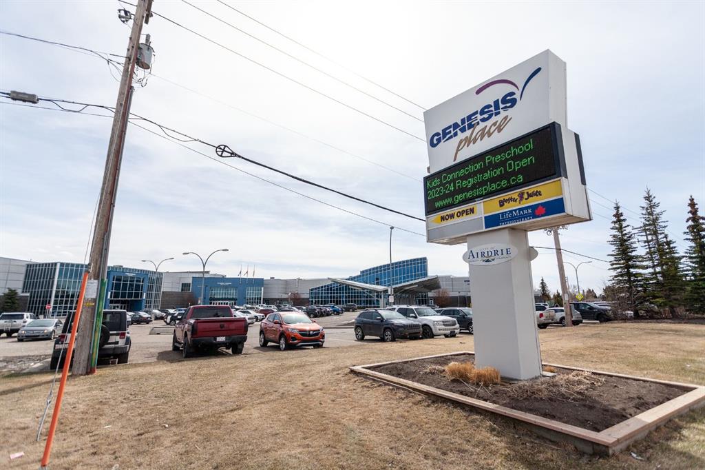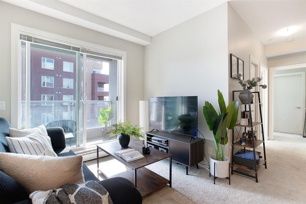 Discover unparalleled convenience and comfort in this beautifully updated, 847 sqft south-facing condo. With 2 bedrooms and 2 bathrooms, the functional floor plan expertly maximizes space and light, delivering a bright, inviting atmosphere through its open-concept design. Enjoy a spacious living room that flows seamlessly out to your exclusive, sunny balcony. The kitchen is a highlight, featuring warm walnut cabinets, a neutral backsplash, and a large island with seating for four, making it perfect for both casual meals and entertaining. Thoughtfully designed for privacy, the primary bedroom boasts a private 3-piece ensuite and is filled with natural light from a large window. This unit also includes a generously sized second bedroom, a full 4-piece main bathroom, and convenient in-suite laundry. The location is simply unbeatable: Situated on East Lake Boulevard, you are literally across the street from Genesis Place! Walk to Bert Church High School, the outdoor hockey rink, tennis courts, and nearby shopping. This bright, modern home in a well-maintained building is move-in ready and the ideal, hassle-free choice for first-time buyers, down sizers, or savvy investors. Book your showing today!
