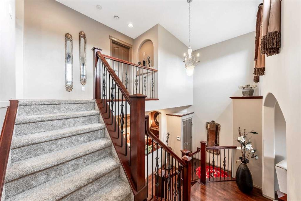 Former Jayman Showhome in Cougar Ridge offering over 3,000 sq.ft. of bright, well-designed living space with a fully finished walkout basement. The main floor features 9 ft ceilings, hardwood floors, and an open kitchen with granite counters, stainless steel appliances, and an island. A few steps up, a cozy bonus room provides a bright flex space. Upstairs includes three bedrooms, a primary bedroom with walk-in closet and 5-piece ensuite with double sinks, a second full bathroom with double sinks, and a large office. The walkout basement has large windows, two bedrooms (one with high ceilings), a full bathroom, a spacious rec area, and a living room with floor-to-ceiling stone fireplace and bar. Additional features include a finished and insulated garage, new water heater, new washer, updated basement flooring, A/C, central vac, sound system, and a mature treed yard. Located on a quiet street near a pond, scenic trails, and top amenities.