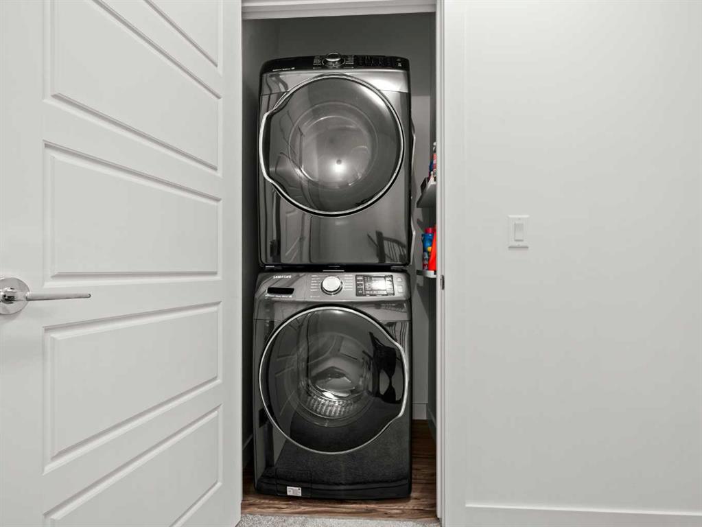***Open House Saturday Dec 6th, 1pm-3pm & Sunday, Dec 7th, 1pm-3pm****Well-designed townhome in Montgomery offering a great balance of space, light, and function. The open-concept main floor features a seamless flow between the living room, kitchen, and dining area. The living room has east-facing windows providing natural light throughout the day and a gas fireplace with built-in shelving and cabinets. The kitchen features a large island with an integrated sink, dishwasher, and drawers providing additional storage, offering ample prep and seating space for casual dining or entertaining. It comes with a stainless steel appliance package including a gas range and microwave hood fan. A convenient half bath completes the main floor. Upstairs are two bedrooms, each with its own ensuite bathroom. The primary bedroom features vaulted ceilings, a large window, and space for a desk or reading area. It is pre-wired for a wall-mounted television, and the adjacent private balcony provides a peaceful spot to enjoy the sunrise. The five-piece ensuite includes dual vanities with quartz countertops, a jetted soaking tub framed by tile, a glass and tile shower, and a skylight for added brightness. A walk-in closet connects directly from the ensuite. The second bedroom includes a walk-in closet accessed through its full four-piece ensuite. A stacked washer and dryer complete the upper floor.