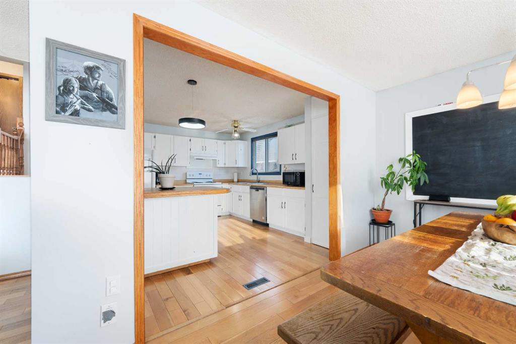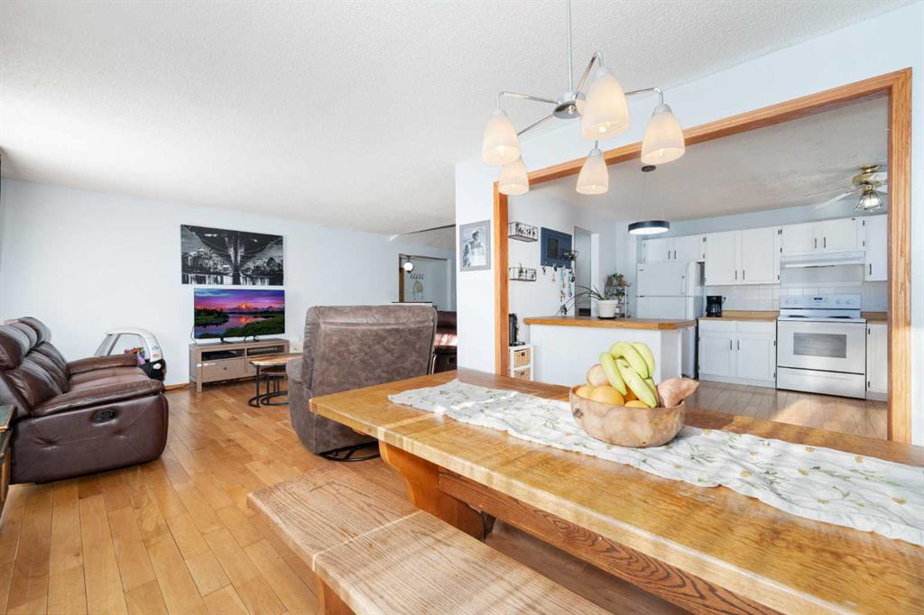 Welcome home to this charming and welcoming updated four-level split, perfectly situated on a quiet street in the desirable community of Maplewood, Strathmore. Offering spacious living, smart design, and fantastic outdoor amenities, this property is truly move-in ready and ideal for a growing family. As you enter, you'll be greeted by the bright and open concept main level, featuring a seamless flow between the living and dining areas, perfect for entertaining. The heart of the home is the large, functional kitchen featuring butcher block countertops and an abundance of cabinet and counter space for easy organization and meal prep. The upper floor provides a tranquil retreat with two generously spacious bedrooms and a shared, well-appointed 4-piece main bathroom, ensuring comfort for the whole family. The first lower level is dedicated to relaxation, featuring a sun-filled family room with patio doors offering direct, walk-out access to the beautifully landscaped backyard, blending indoor and outdoor living. This level also includes a bright third bedroom and a convenient 3-piece bathroom, ideal for guests or a home office. The lowest level—the fully finished basement—adds incredible value and versatility. It boasts a fourth distinct living space, a large recreation room perfect for games, and plenty of utility/storage space with dedicated laundry facilities. Recent updates include a brand new roof and shingles that were installed in July 2025 on both the house and the oversized garage. Furthermore, three new rear windows in the bedrooms feature triple-pane glass, significantly enhancing energy efficiency and comfort. The exterior is equally appealing. The property features an oversized single detached garage that is nearly tandem in depth, offering excellent storage potential. The extra-long driveway is a huge asset, providing parking for an additional three vehicles. Location is key, and this home delivers. Situated on a quiet street, you're literally around the corner from a neighbourhood park and local schools, plus a fantastic sledding hill for winter fun. For year-round enjoyment, the Strathmore Aquatic Centre is just a couple of minutes away. This Maplewood gem perfectly balances comfortable family living with an ideal location and crucial modern updates. Don't miss your chance to call this exceptional property home!