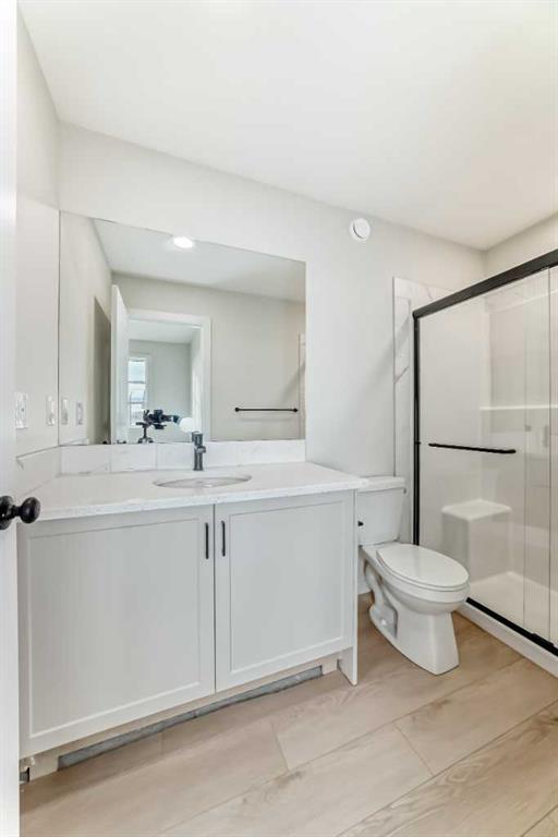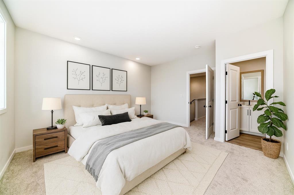 Upstairs, the three bedrooms are all properly sized, not token add-ons. The master includes a WINDOWED WALK-IN CLOSET and a clean 3-piece ensuite featuring the UPGRADED 60" × 33" SHOWER with sliding glass door. The full main bath repeats the quartz and tile finishes, and the upper-floor laundry stays exactly where it should—central, but out of the way.