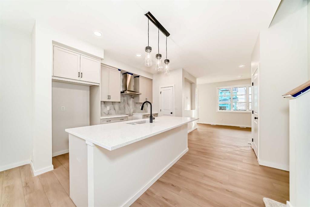 The main floor opens with 9' CEILINGS and a central galley kitchen that’s designed to work for real everyday life. You get White Rock quartz, a SILGRANIT UNDERMOUNT SINK, 42" UPPERS, classic matte tile backsplash, a CHIMNEY-STYLE HOOD FAN, and a flush 12" breakfast bar that offers actual seating space. The appliance package—Whirlpool fridge, electric range, dishwasher, and BUILT-IN MICROWAVE with trim kit—is already selected and included, matched to the kitchen layout and cabinetry finishes.