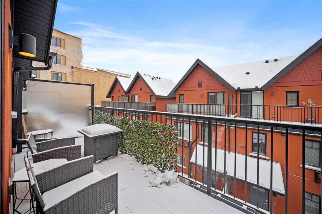 Three bedrooms, two bathrooms, dedicated storage, and titled parking come together in a boutique brick row building with subtle brownstone vibes and classic urban styling. This townhome blends vibrancy, privacy, and low maintenance living in one of Calgary’s most walkable locations. Just moments from the energy of 17th Avenue and the Beltline, you are surrounded by fabulous local dining, cafes, boutique fitness, and everything that makes inner city living so coveted. Tucked away from the street for added peace, the secure setting of the building creates an inviting atmosphere where, in the warmer months, neighbours often unwind on their own private terraces with barbecues or a glass of wine, adding a warm community feeling while maintaining personal privacy. Inside, this home offers the spaciousness of a traditional layout with the ease of condominium living. The modern kitchen features quartz counters, stainless steel appliances including a five burner gas range, generous cabinetry, a breakfast bar for casual meals, and the option to take dinner parties to the dining table that easily seats six. It all flows naturally into the inviting living area where a cozy gas fireplace anchors the room. The second level includes two comfortable bedrooms, a four-piece bathroom, and full size laundry. One more level up is the dedicated entirely to the primary retreat, the true showstopper of the home. This primary bedroom feels both serene and elevated with its soaring vaulted ceilings, wrapped in windows and offers a truly calming sense of space. A generous walkthrough closet offers abundant hanging space and leads to the relaxing spa inspired ensuite complete with double vanities, a glass shower, a deep soaker tub, and the added luxury of heated floors. Topping off this decadent level is the private balcony, perfectly positioned to overlook the front courtyard while capturing beautiful westerly views. The lower parkade entry level has a spacious flex or storage room which provides loads of shelving for effortless organization. This home also includes two additional outdoor lounging spaces; A charming backyard area offers a quiet spot for al fresco dining and relaxing, while the welcoming front terrace is ideal for morning coffee, evening wine, and summer barbecuing with friends. Small pets are welcome too (with board approval), and some owners have created a cute outdoor relief spot in their backyard - on leash or with board approved fencing, ideal for quick winter outings with your furry friend. Your secured and titled indoor/heated parking stall is conveniently located beside your parkade door with room for a bike. This beautifully maintained unit is also offered turn-key (move-in ready) with it’s furnishings & all kitchen items … for a seamless move. With only nine units in the building and close proximity to parks, schools, gyms, hot yoga, shopping, transit, and major routes, this home delivers elevated inner city living at its finest.