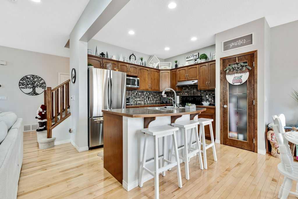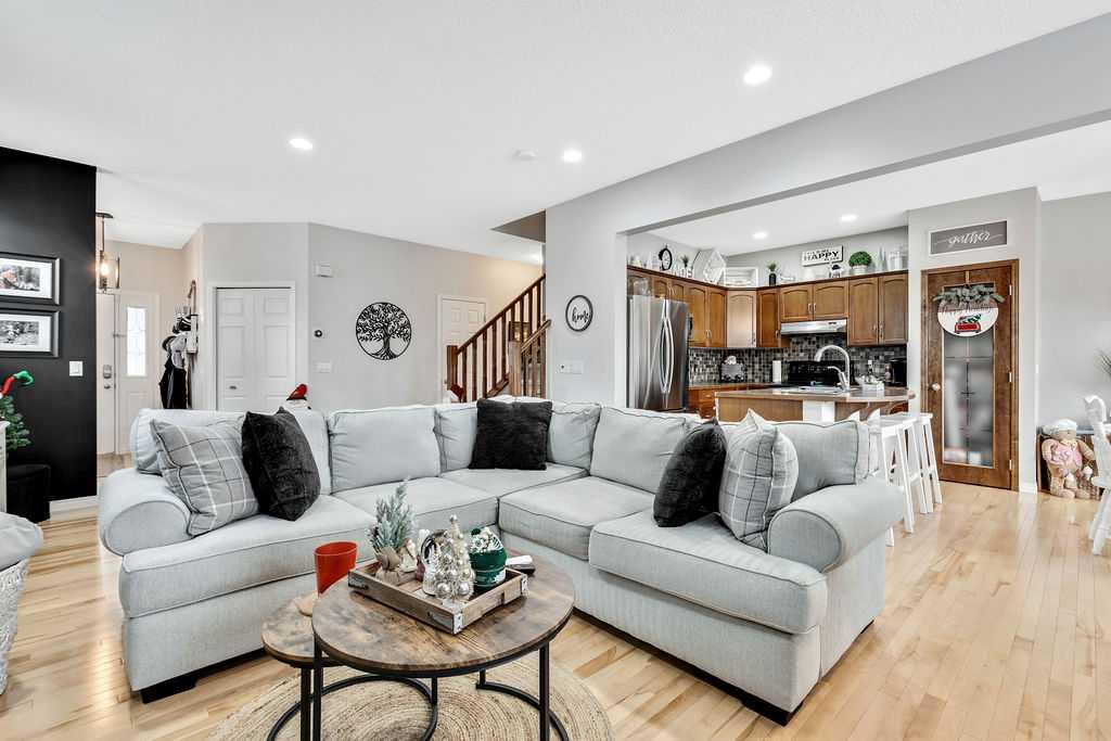 The main floor features a bright, open-concept layout. The kitchen showcases maple cabinetry, Stainless steel appliances and a natural slate backsplash, flowing seamlessly into the inviting living room, complete with a cozy gas fireplace. A convenient 2-piece bathroom finishes off this level.