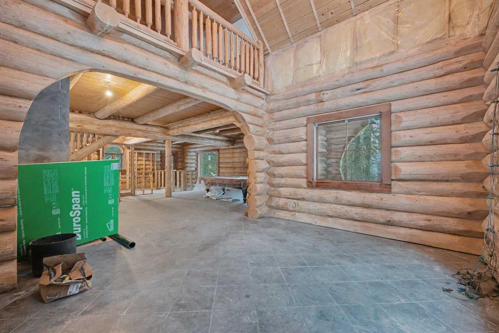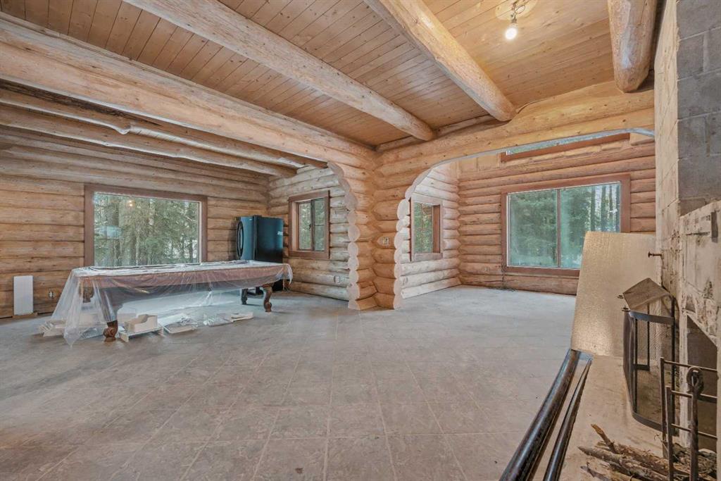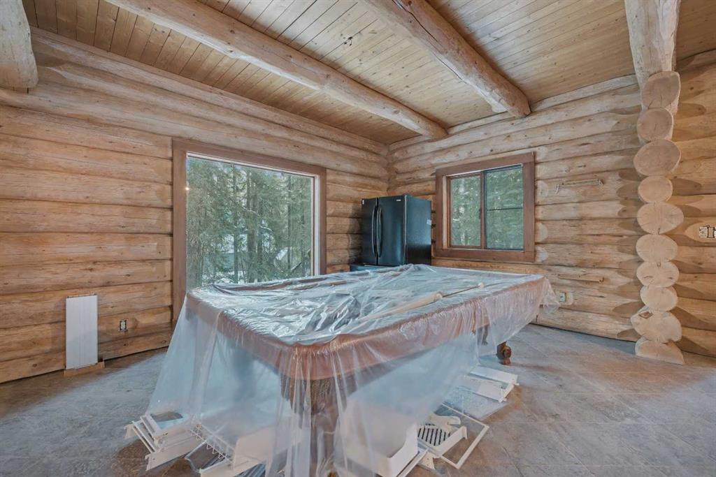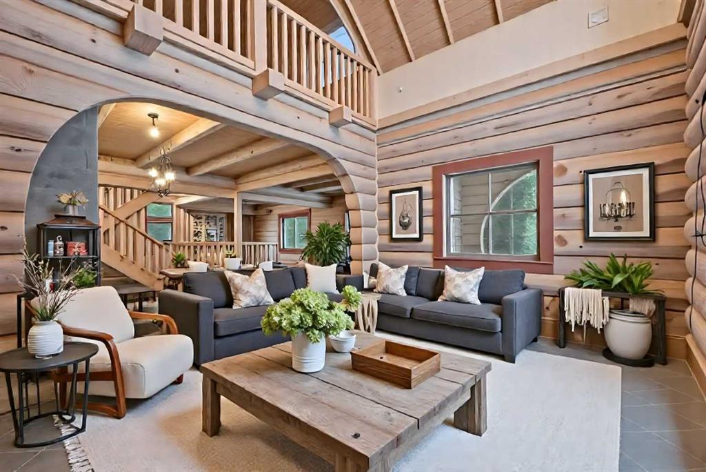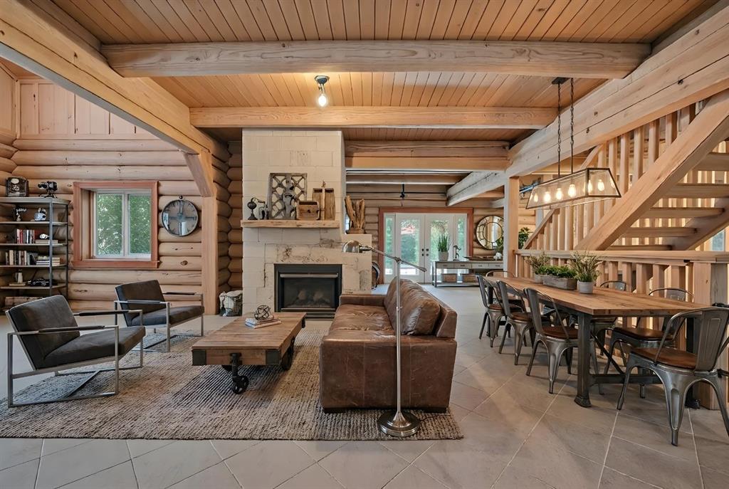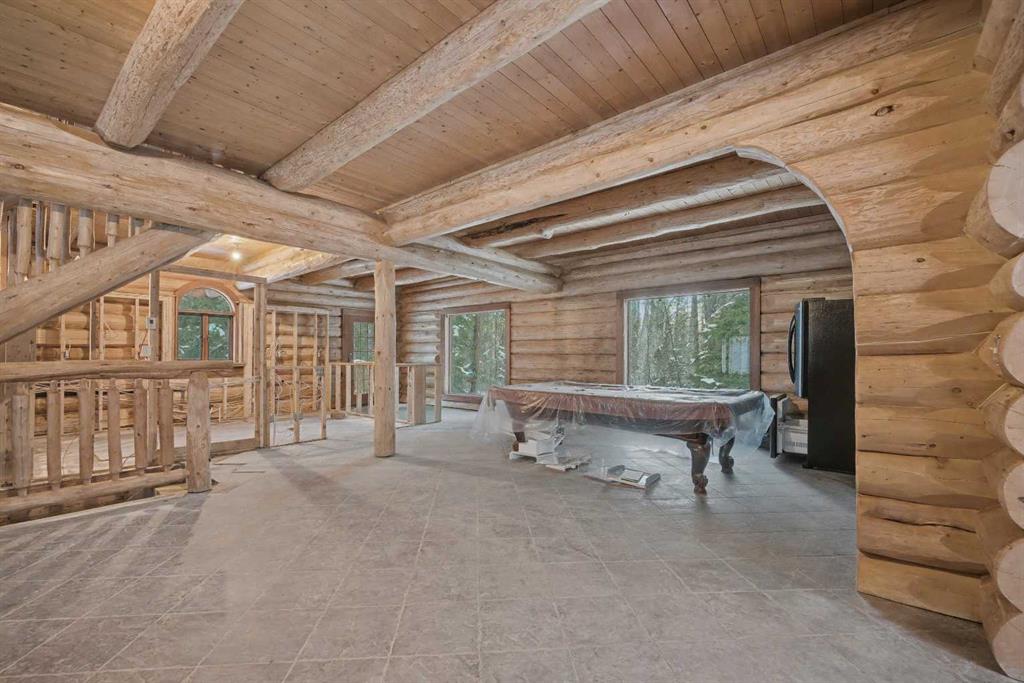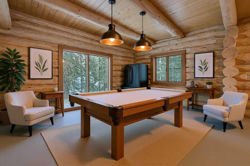 Additional features include a heated double garage, interior logs professionally dry ice–treated, a 20-year-old roof, and a pool table included with the sale.